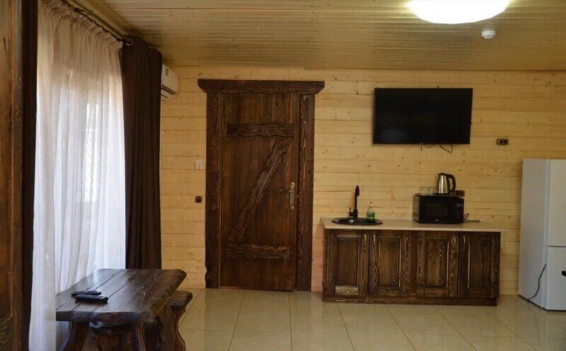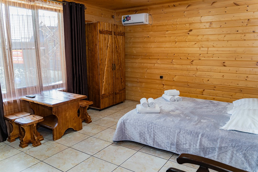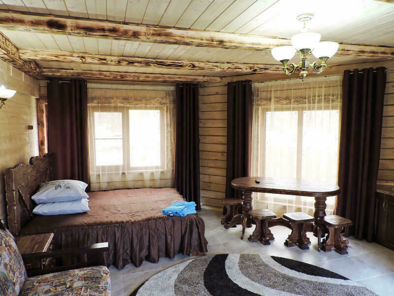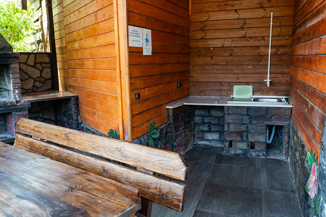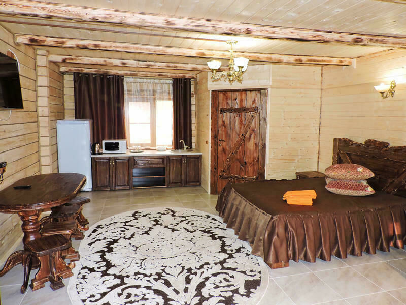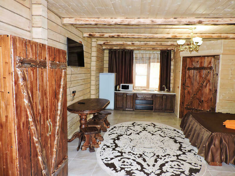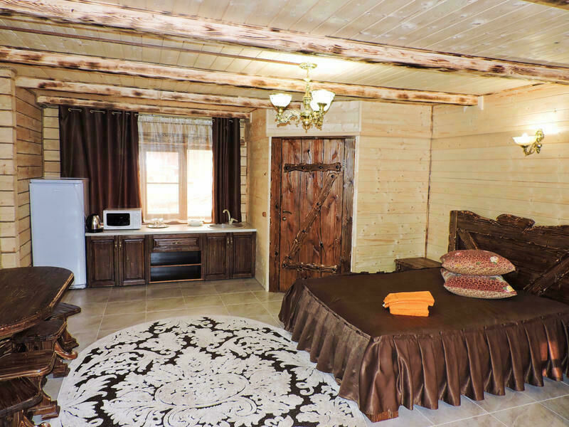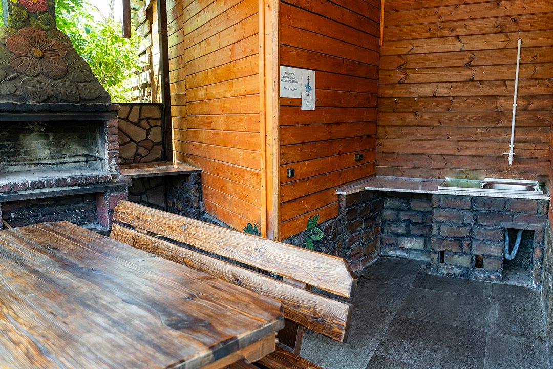 Бесплатно: подогреваемый бассейн, беседка, мангал, автостоянка для машин во дворе, фен по запросу. Домик сделан из дерева.