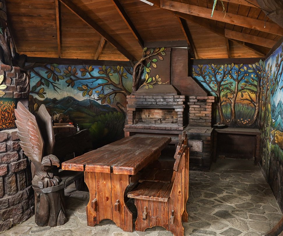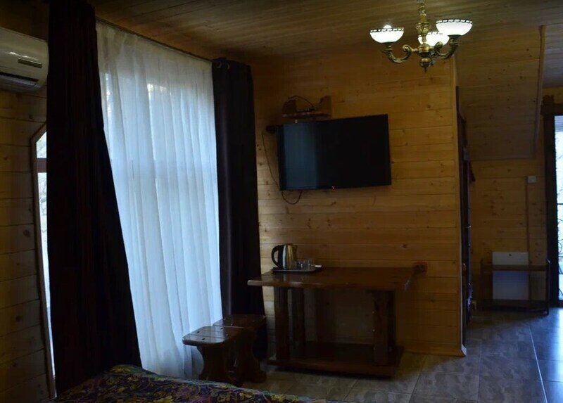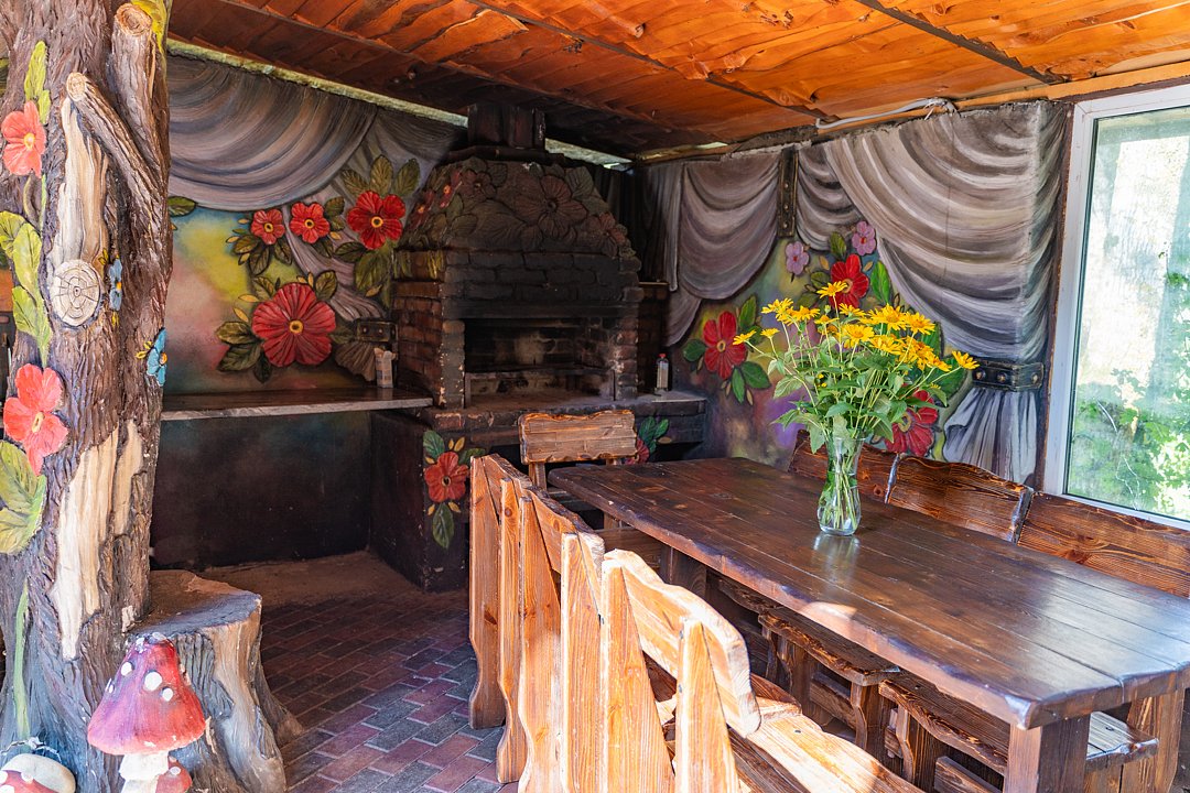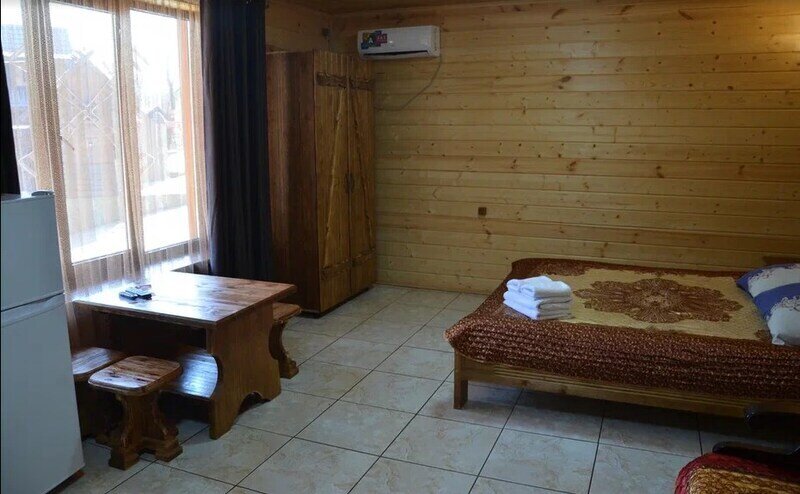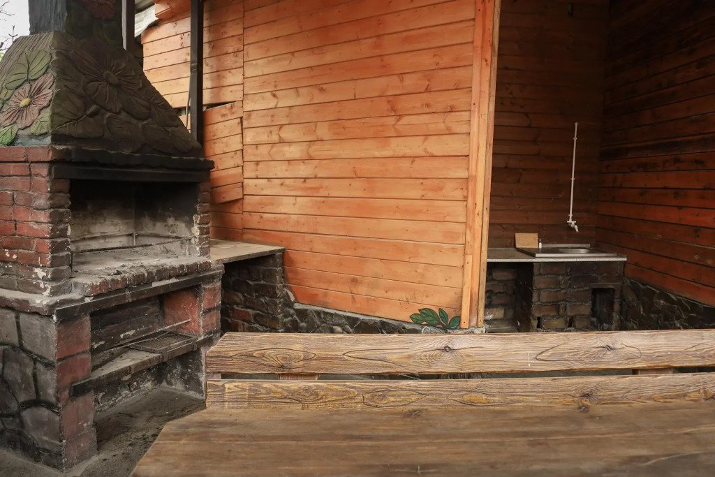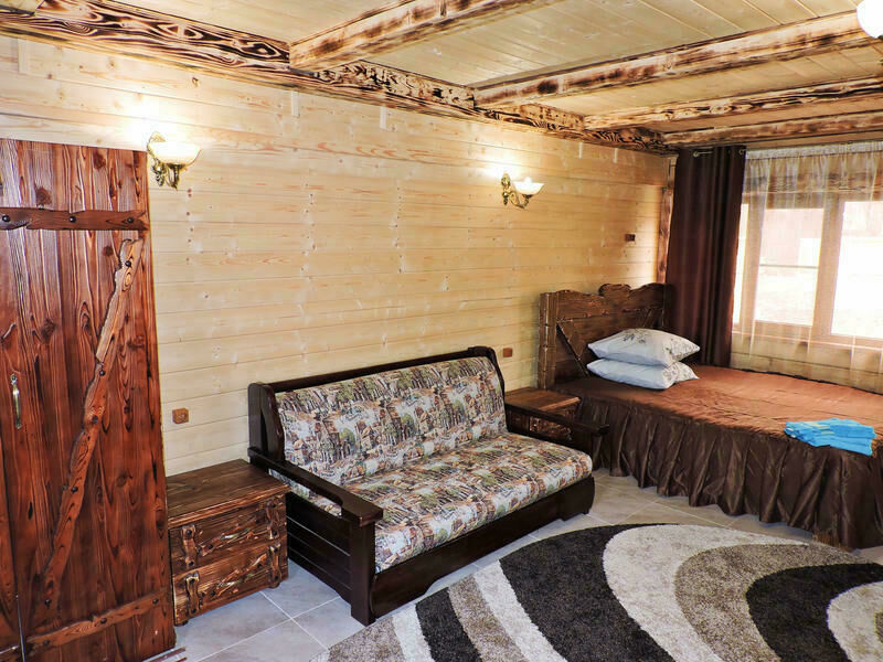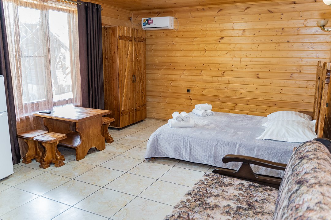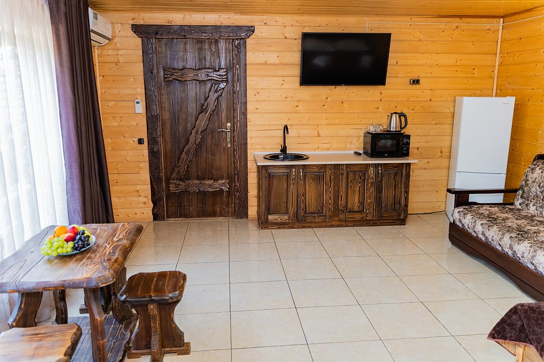 Бесплатно: подогреваемый бассейн, беседка, мангал, автостоянка для машин во дворе, фен по запросу. Домик сделан из дерева.