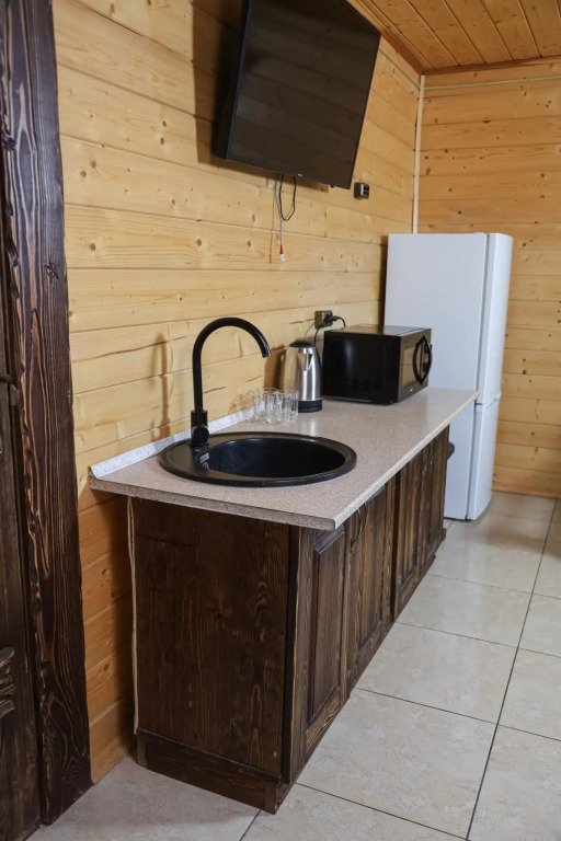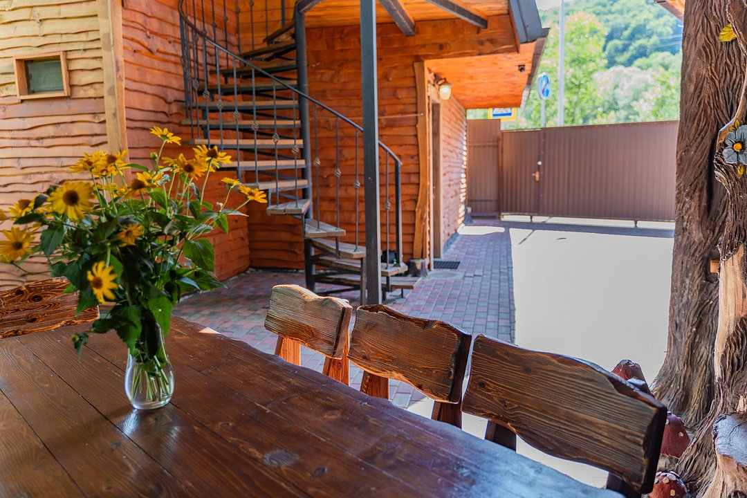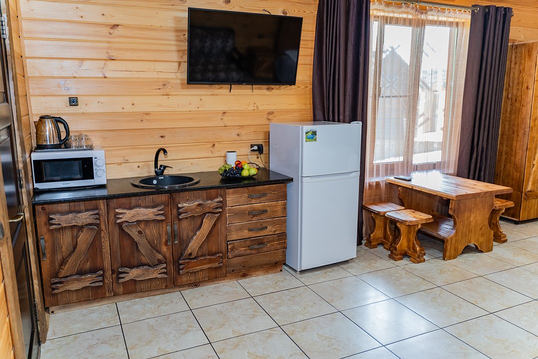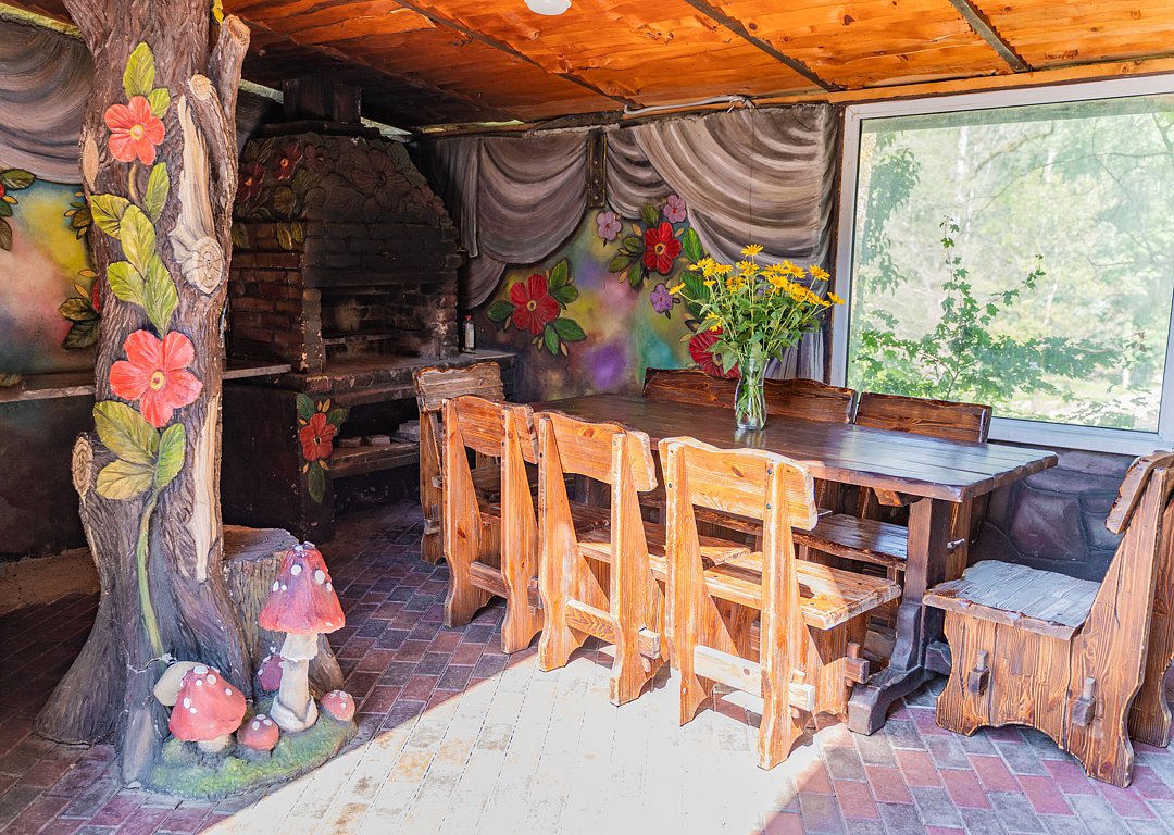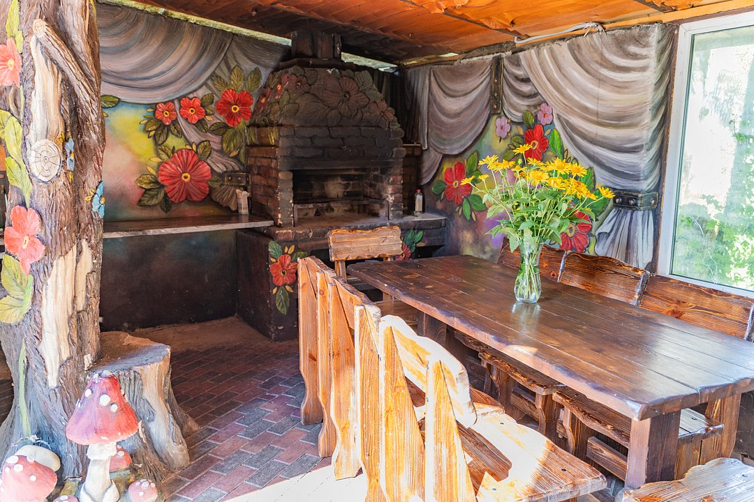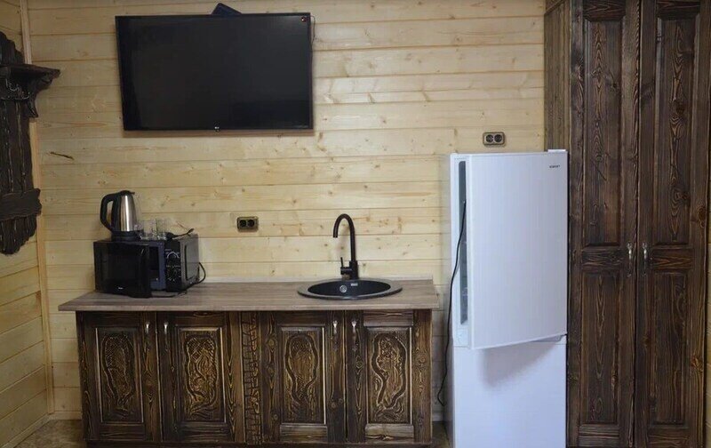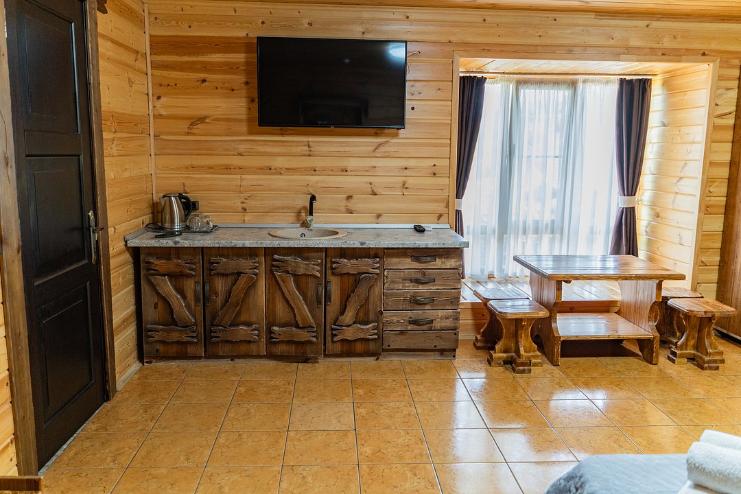 Бесплатно: подогреваемый бассейн, беседка, мангал, автостоянка для машин во дворе, фен по запросу. Домик сделан из дерева.