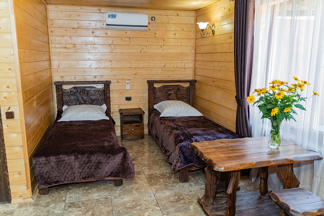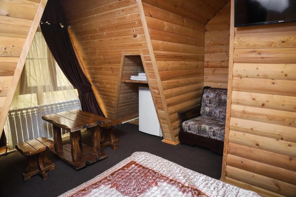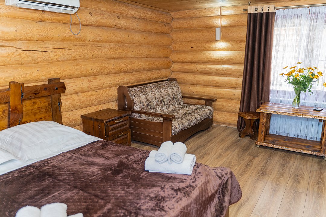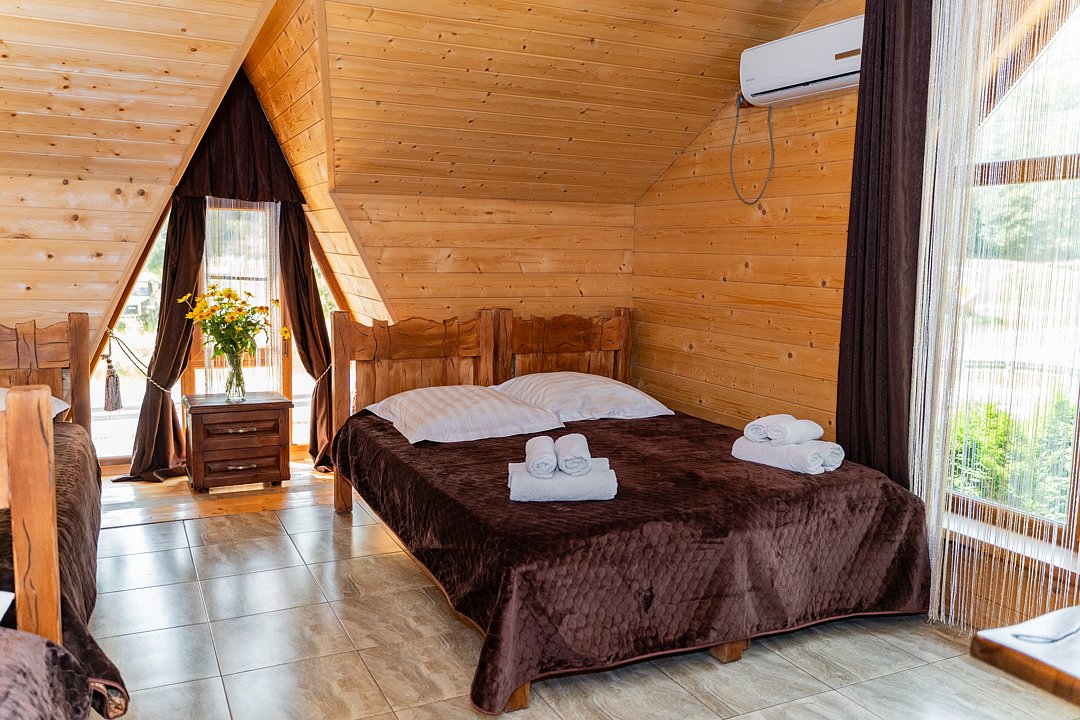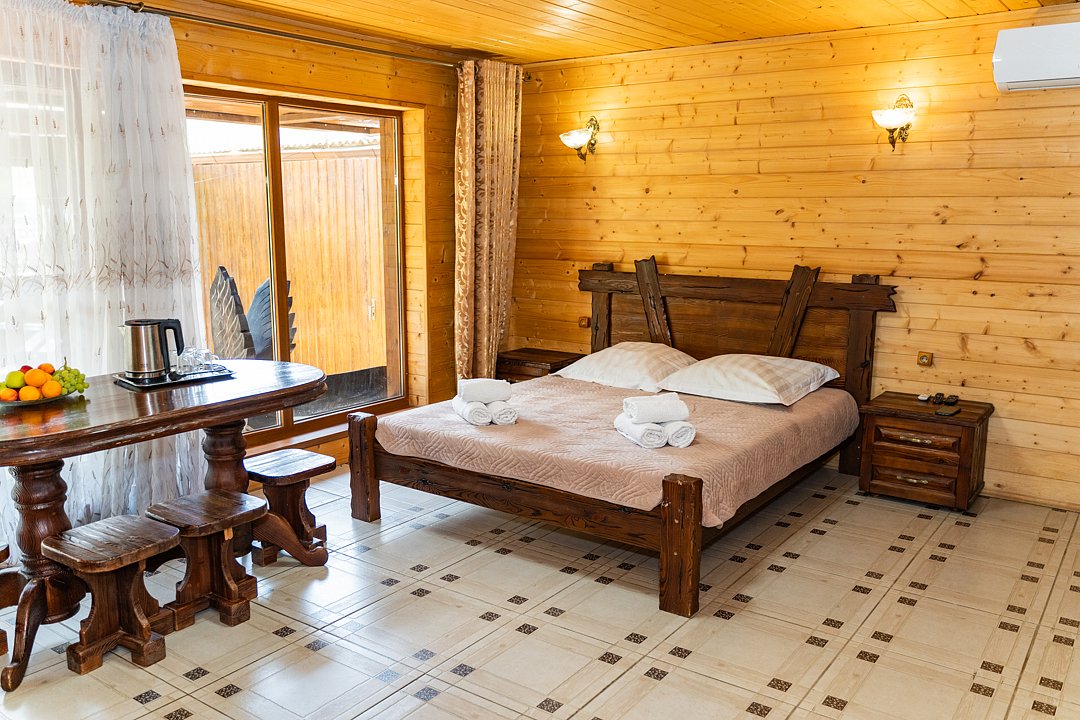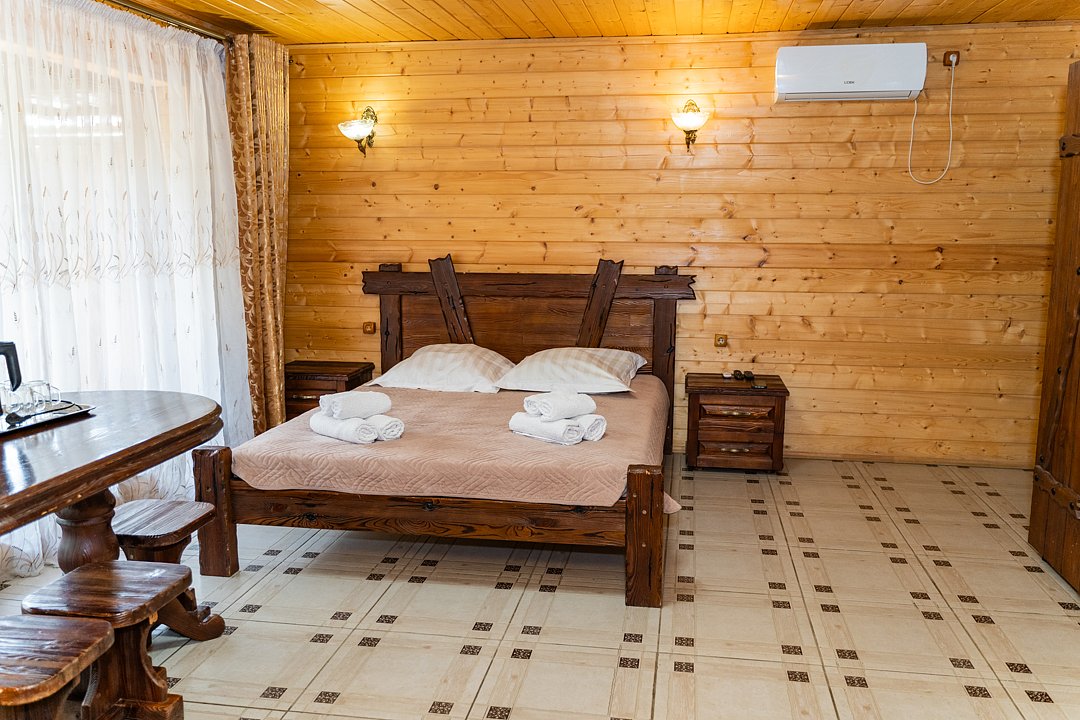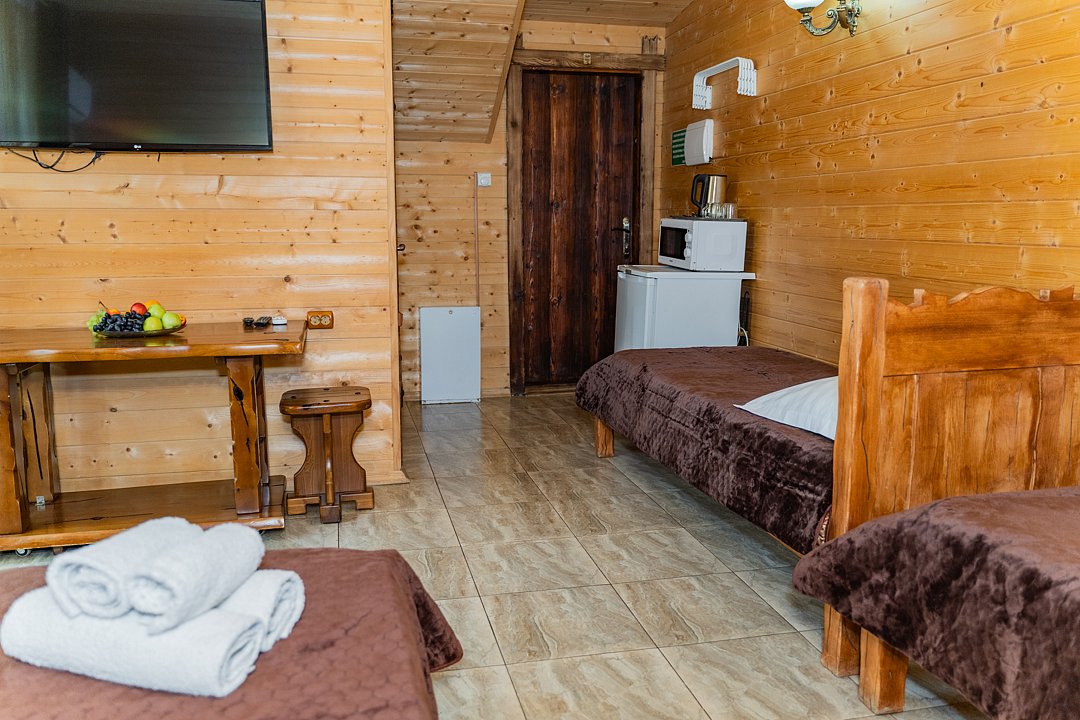 Для заселения предназначены номера в здании гостиницы и коттеджи. Внутренняя отделка помещений выполнена из натурального дерева, поэтому жильё является экологически чистым. Для комфортного проживания обеспечены все удобства.