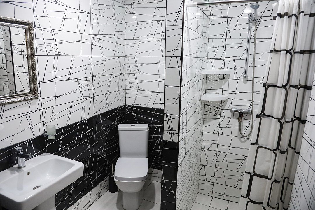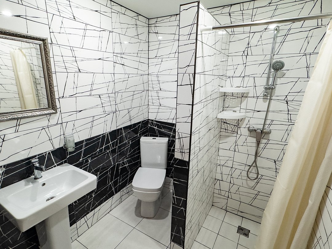 В номере имеется все необходимое — это кровать, шкаф для одежды, телевизор, кондиционер, холодильник, чайник, микроволновая печь, раковина, душ, санузел.