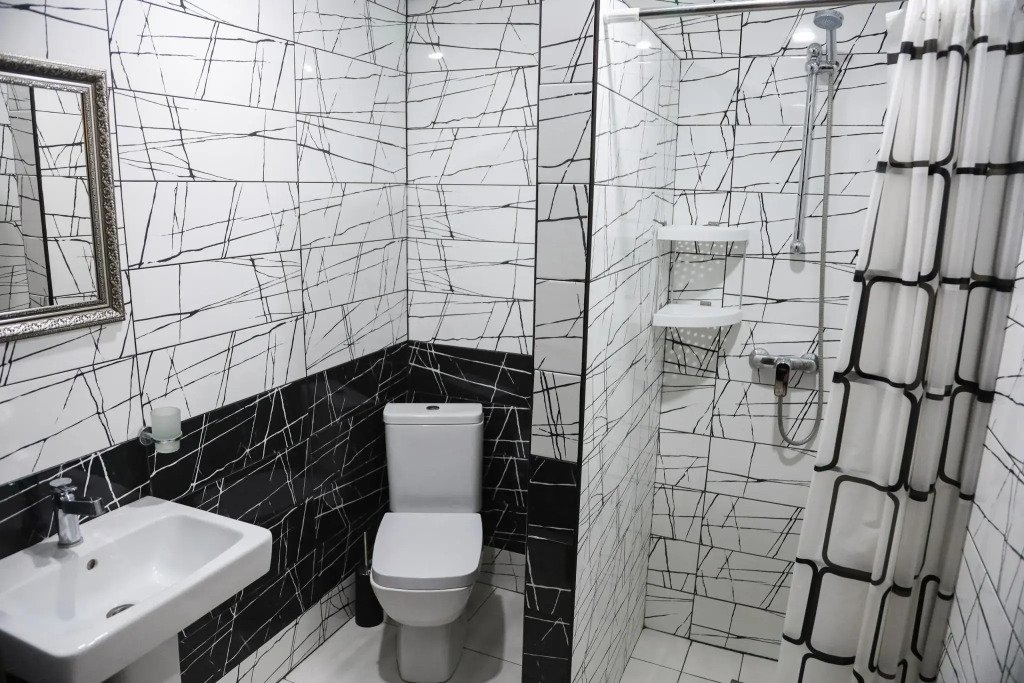 Кондиционер, туалет и ванная комната, телевизор с плоским экраном, холодильник, электрический чайник, шкаф, туалетная бумага, полотенца.