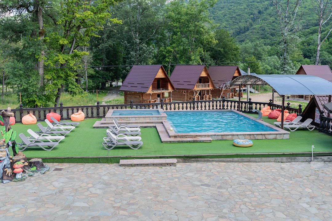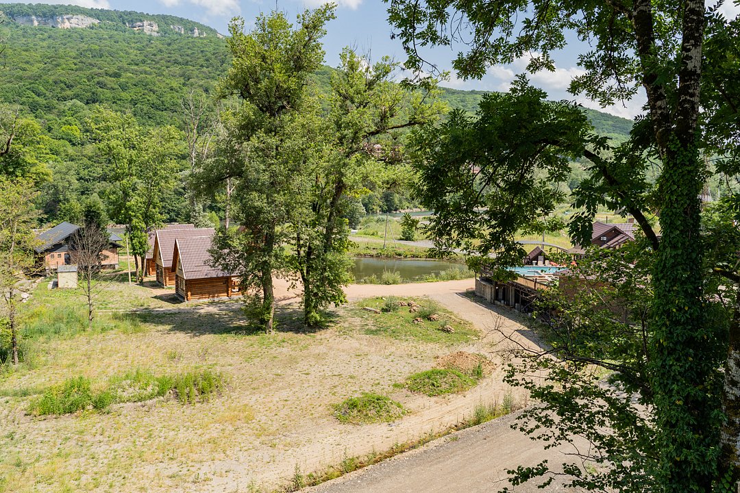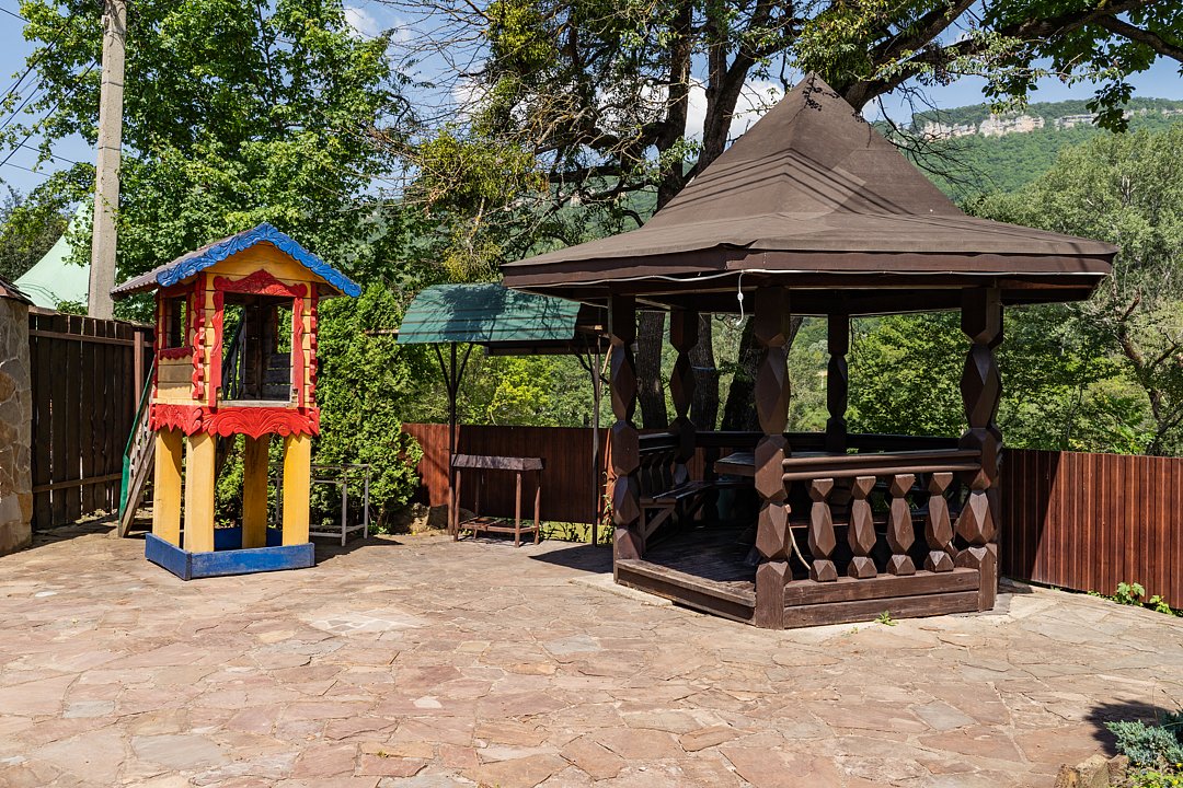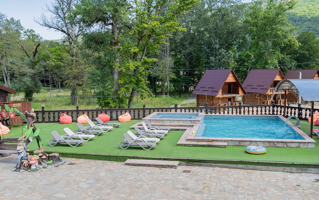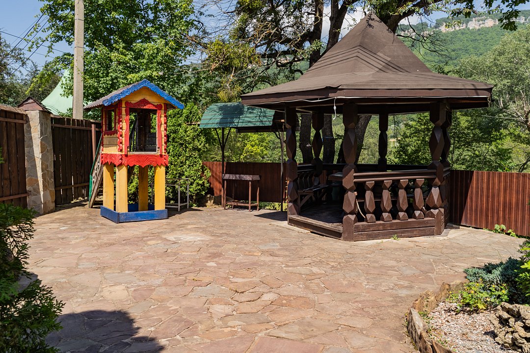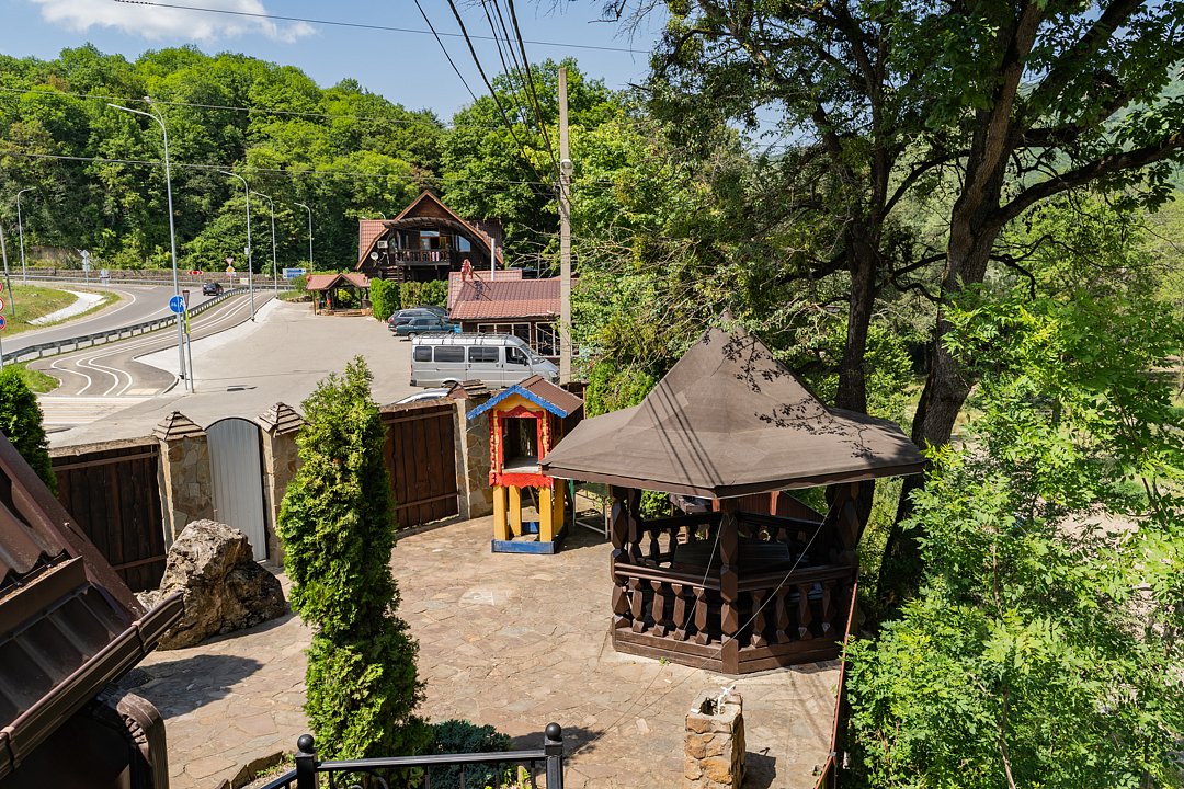 Семейный отдыхДостоинстваРасположение очень удачное, близко канатная дорога, дорога в поселок и на плато. На территории много беседок, мест для пикника Рядом протекает река.
