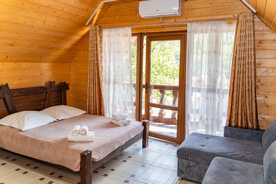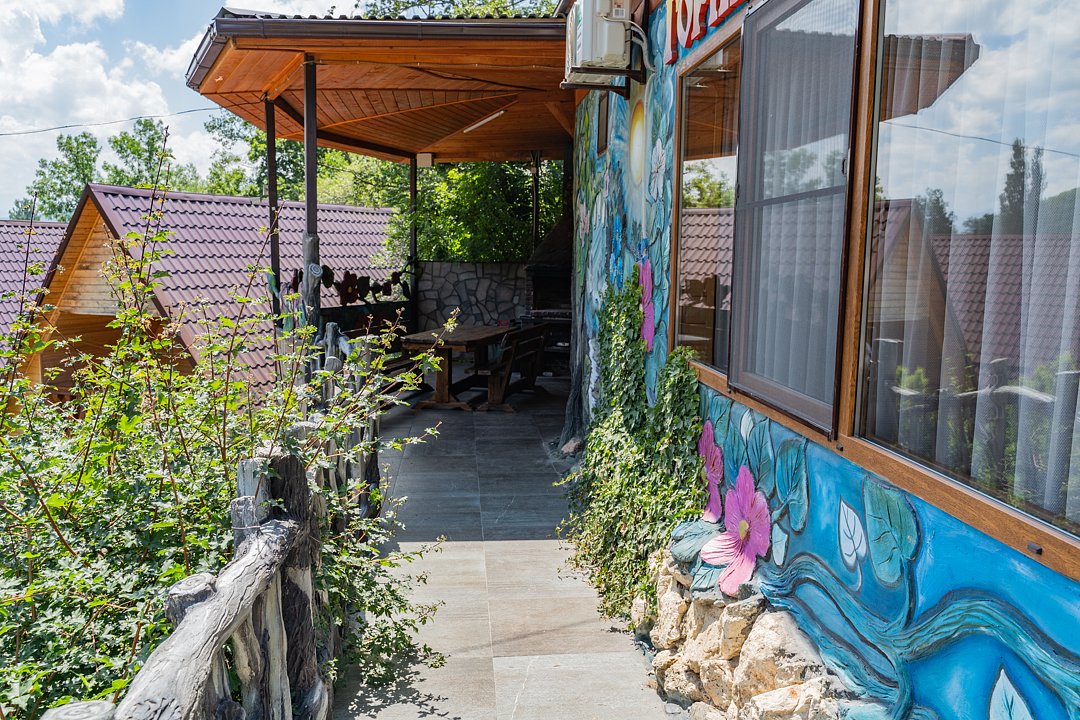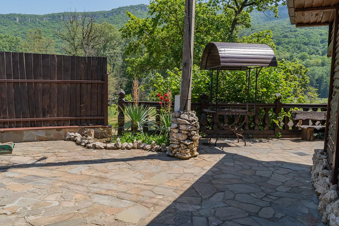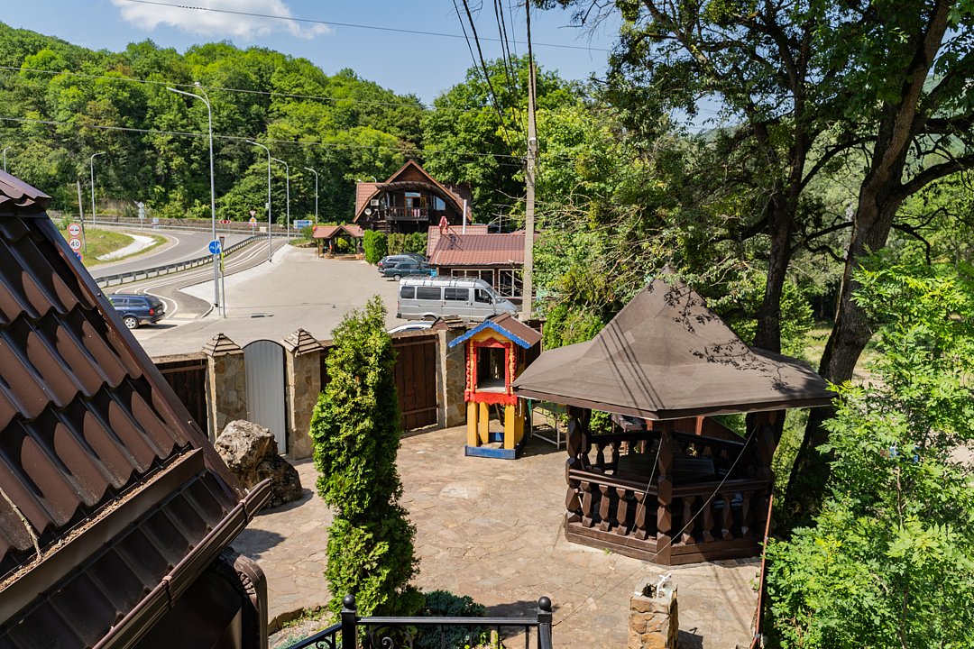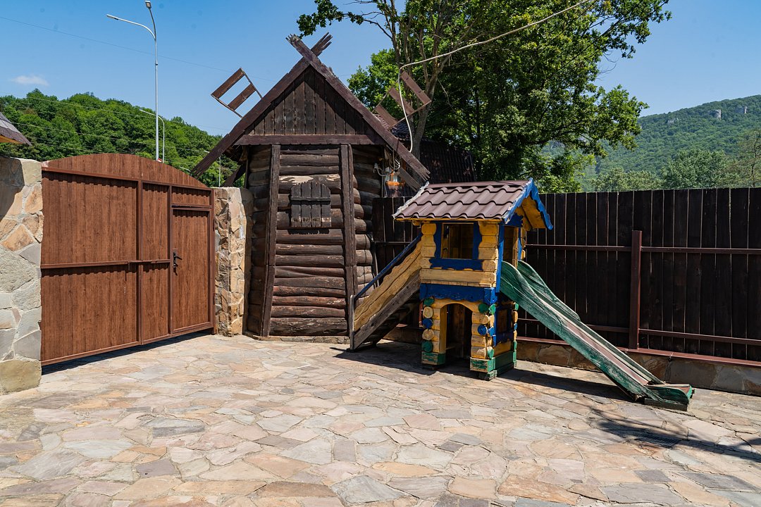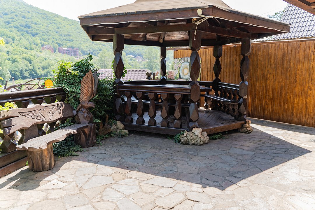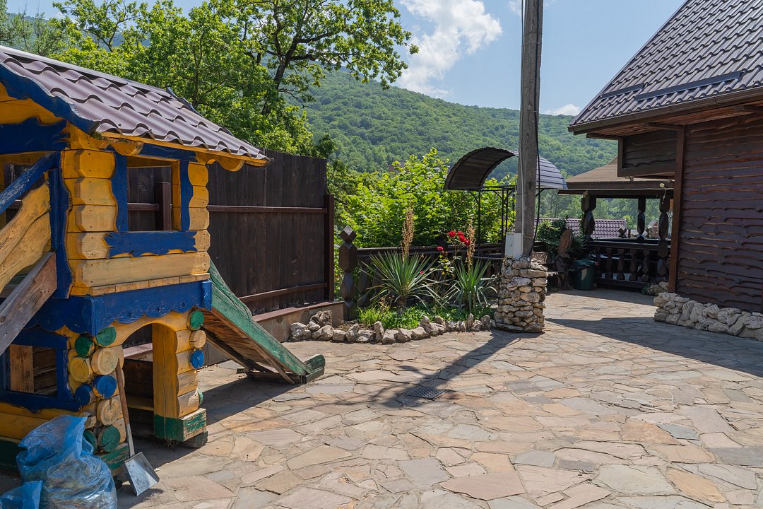 Семейный отдыхДостоинстваРасположение очень удачное, близко канатная дорога, дорога в поселок и на плато. На территории много беседок, мест для пикника Рядом протекает река.