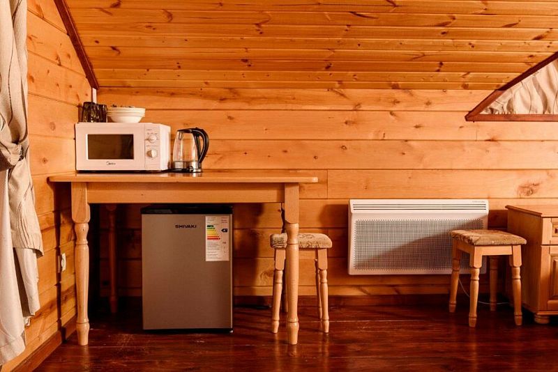 В номере есть всё необходимое для вашего отдыха: микроволновка, чайник, холодильник, посуда, телевизор, полотенца и постельное белье. Также в каждом номере свой туалет и душ. При входе в номер большой стол с лавочками для вечерних посиделок. И конечно, прекрасный вид на горы.
