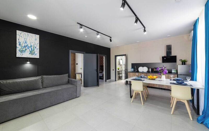 Индивидуальный бассейн с подогревом (круглогодично), Телевизор с плоским экраном,Wi-Fi, телефон, Сплит-система, фен, прикроватные светильники, холодильник , утюг и гладильная доска. 2 Двуспальные кровати, 2 односпальные кровати, багажная тумба, зеркало, диван, шкафы для одежды, письменный стол и стул, вешалки Душ, санузел, раковина, унитаз, зеркало с подсветкой, зубная щетка, зубная паста, шампунь, мыло, гель для душа, лосьон для тела, салфетки, туалетная бумага, халаты, банные полотенца, тапочки, шапочка банная Кухонная мебель, тарелки, нож, ложки, вилки, микроволновая печь, индукционная печь на 2 конфорки, Информационная карта, меню, обслуживание номеров, сейф, чайник, чайный набор, письменные принадлежности, мини-бар в соответствии с ассортиментом (чай, кофе, сахар, вода), косметическое зеркало, стаканы, отопление- теплые полы, швейный набор, ключ для открывания бутылок, губка для обуви, рожок для обувиУслуги и удобства