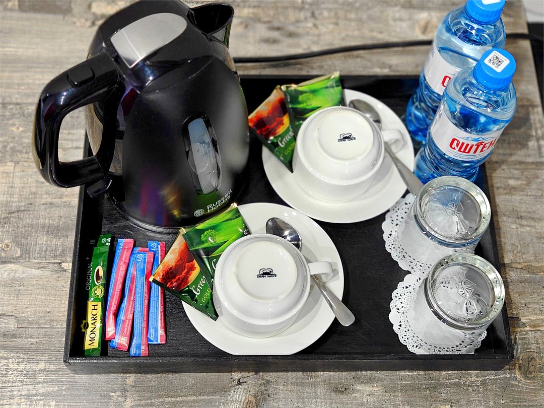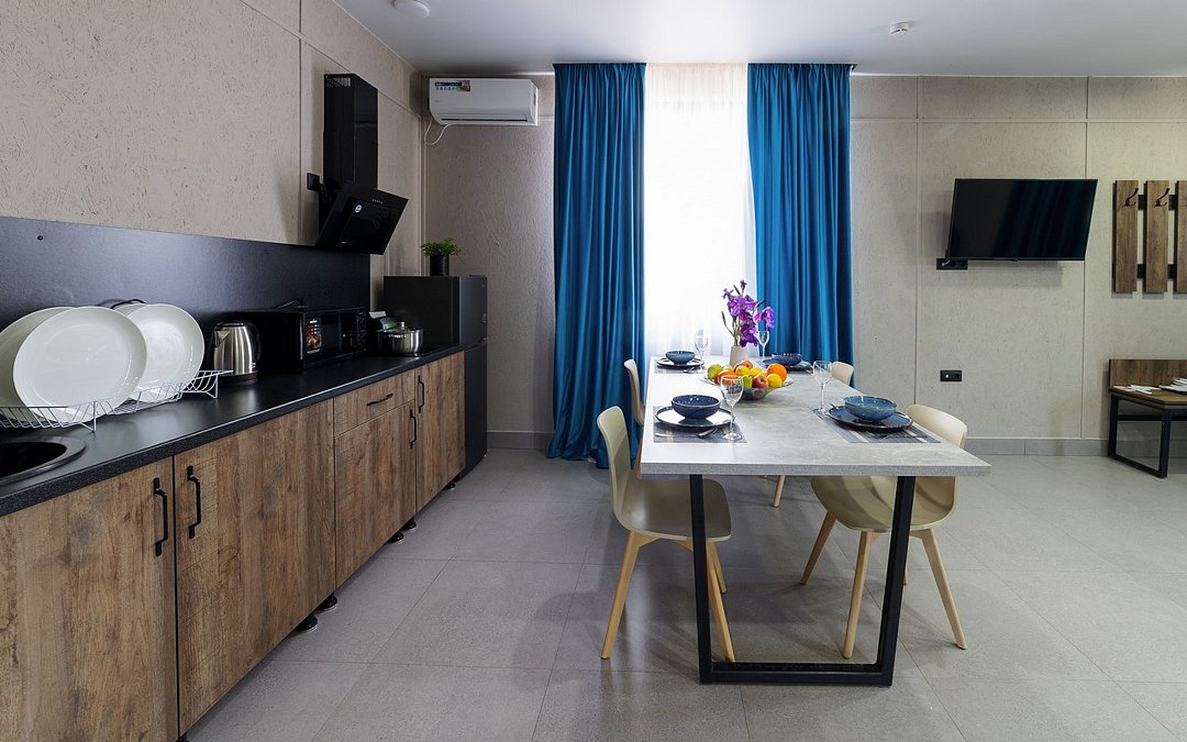 Телевизор с плоским экраном,Wi-Fi, телефон, Сплит-система, фен, прикроватные светильники, холодильник , утюг и гладильная доска. 2 Двуспальные кровати, кресло, багажная тумба, зеркало, диван, шкафы для одежды, письменный стол и стул, вешалки Душ, санузел, раковина, унитаз, зеркало с подсветкой, зубная щетка, зубная паста, шампунь, мыло, гель для душа, лосьон для тела, салфетки, туалетная бумага, халаты, банные полотенца, тапочки, шапочка банная Кухонная мебель, тарелки, нож, ложки, вилки, микроволновая печь, индукционная печь на 2 конфорки, Информационная карта, меню, обслуживание номеров, сейф, чайник, чайный набор, письменные принадлежности, мини-бар в соответствии с ассортиментом (чай, кофе, сахар, вода), стаканы, отопление- теплые полы, швейный набор, ключ для открывания бутылок, губка для обуви, рожок для обуви. Цветовые решения в гостевых домах разные.Услуги и удобства