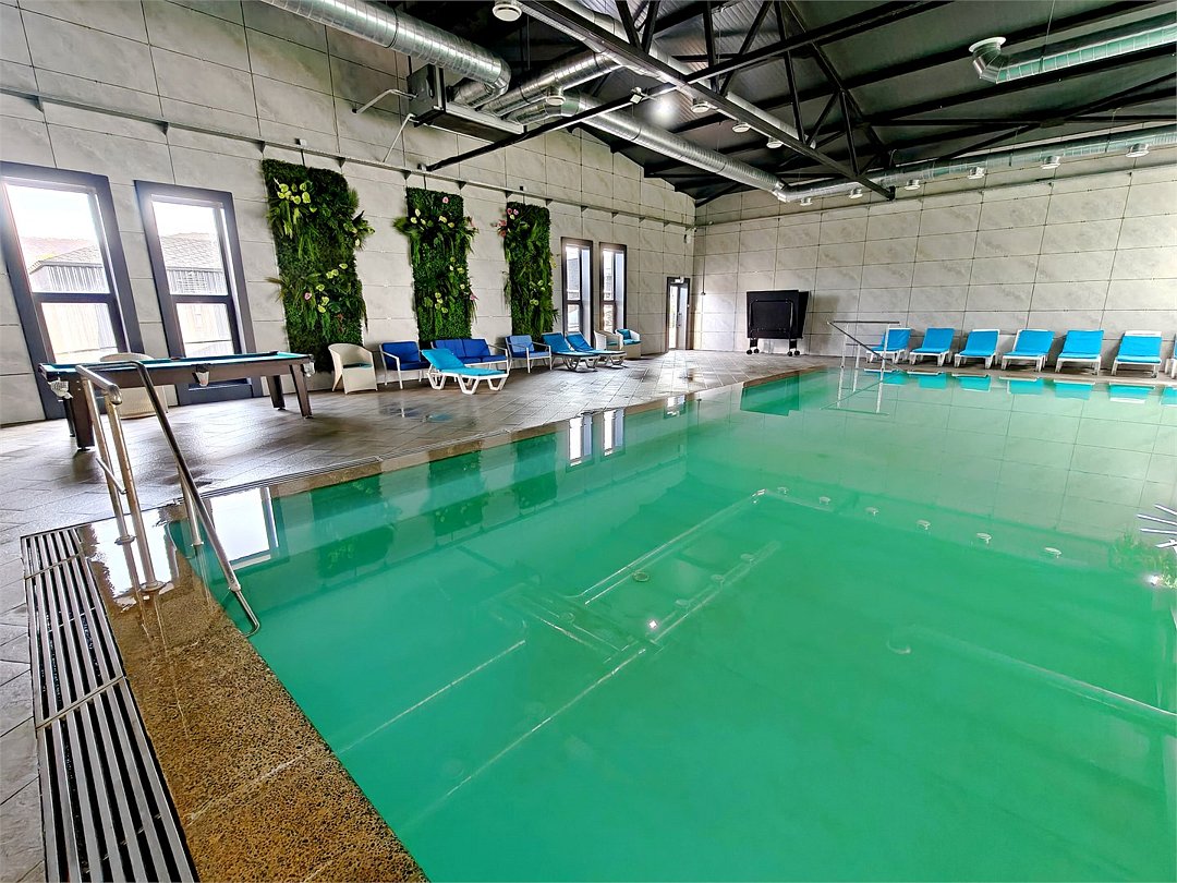 Читать полностьюКрытый бассейн с двумя чашами: с пресной и термальной водой с гидромассажными и аэромассажными группами.