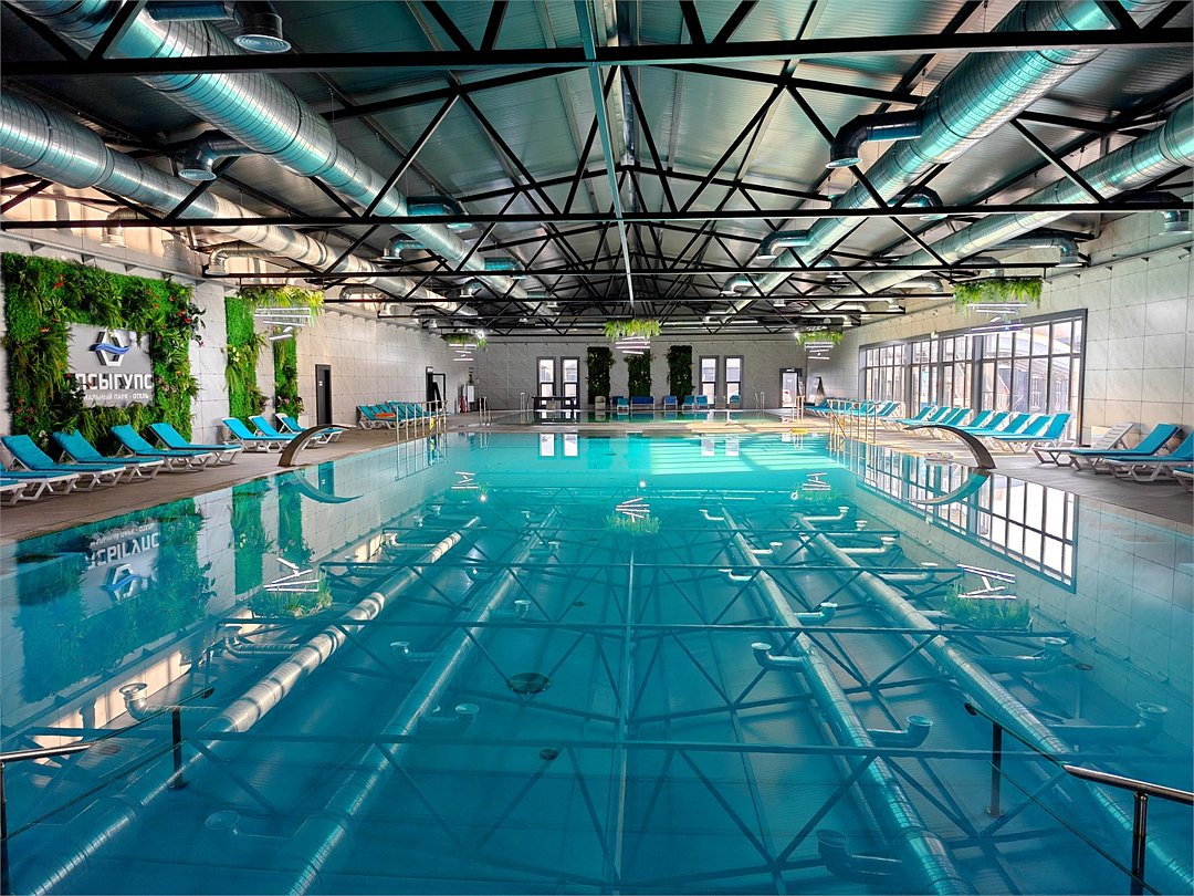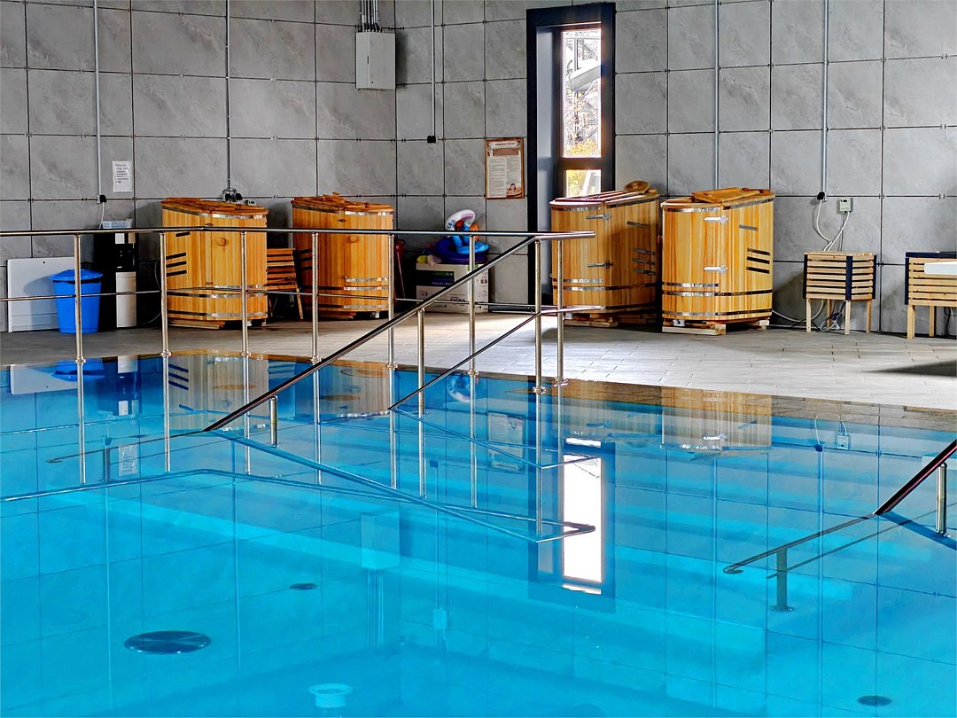 Специальная автоматическая система охлаждает термальную воду (32°–37°), а пресную воду нагревает перед подачей в бассейны (28°–35°) в зависимости от погоды на улице.Крытый бассейн