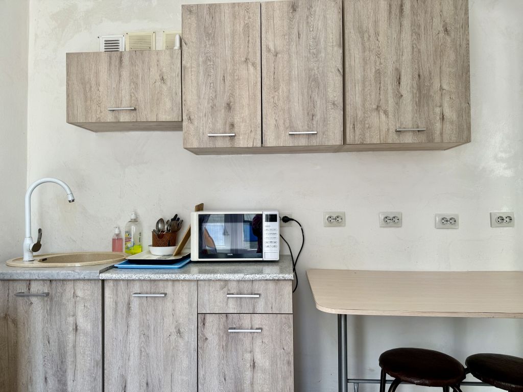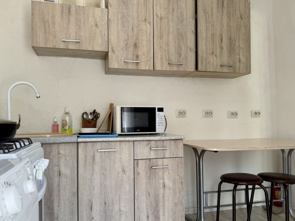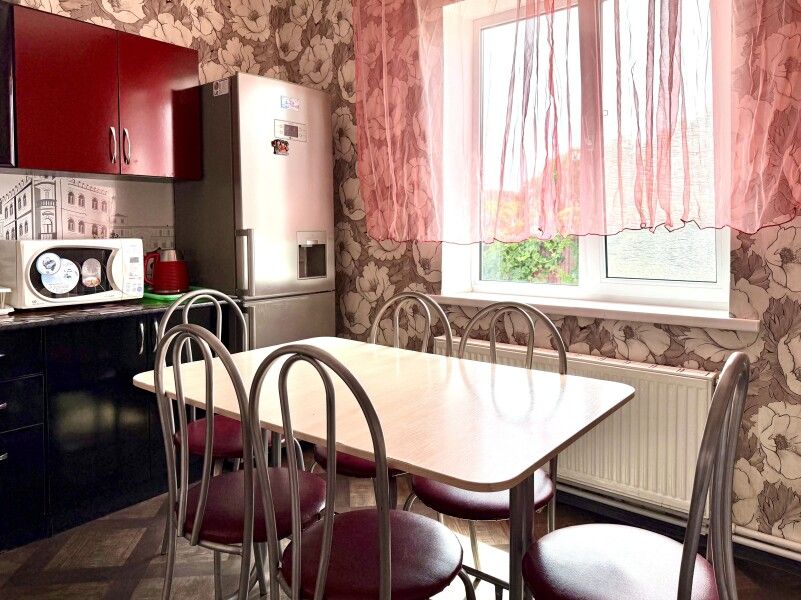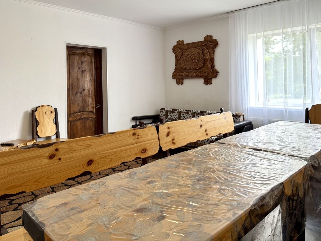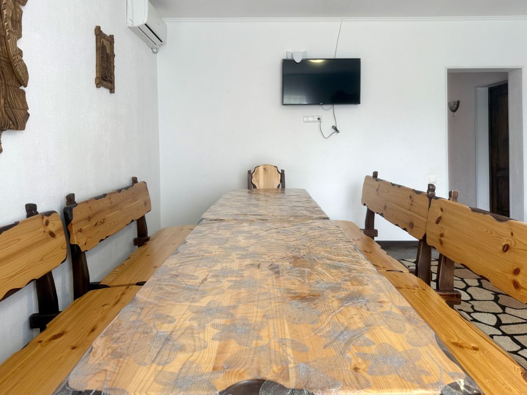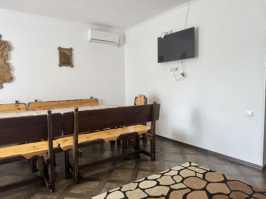 В доме в общем доступе имеется гостиная с кухонной зоной, где есть вся необходимая мебель, столовые приборы и техника.