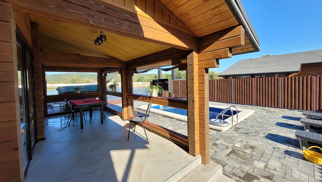 Во дворе коттеджа индивидуальный бассейн с подогревом и гидромассажем, также мангальная зона и зона отдыха, и все это с видом на озеро!