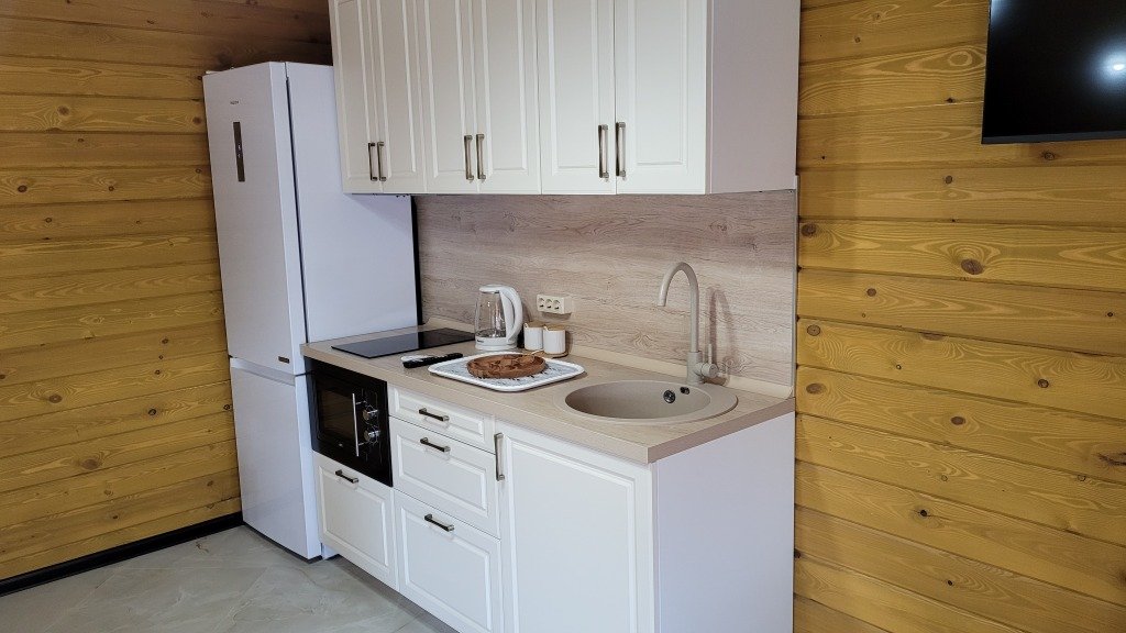 На базе отдыха «Гравитация» гости могут готовить самостоятельно, так как кухни в коттеджах оснащены всем необходимым: электрической плитой, холодильником, чайником и микроволновой печью.