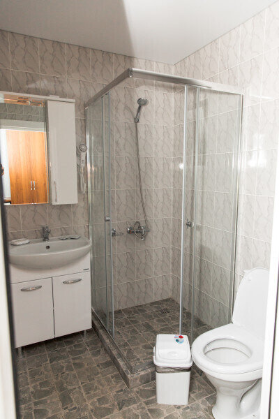 Ванная комната с душевой кабиной и туалетными принадлежностями, предоставляются полотенца, халаты.