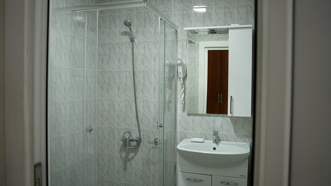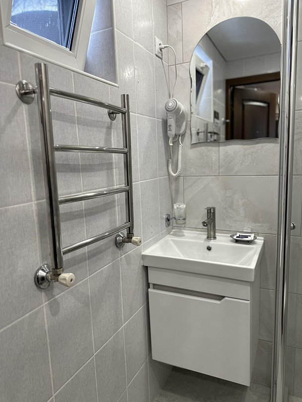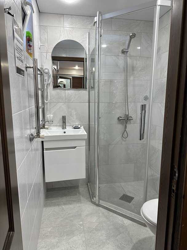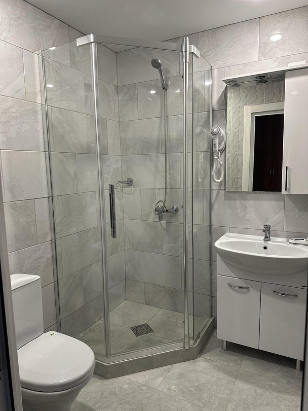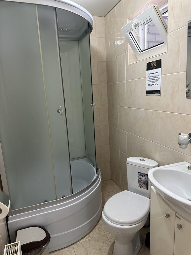 Ванная комната с душевой кабиной и туалетными принадлежностями. Предоставляем полотенца, халаты, тапочки.