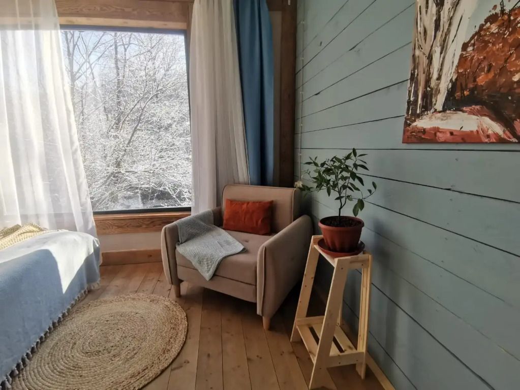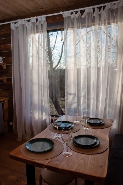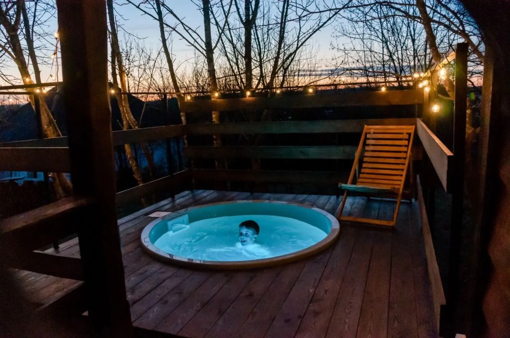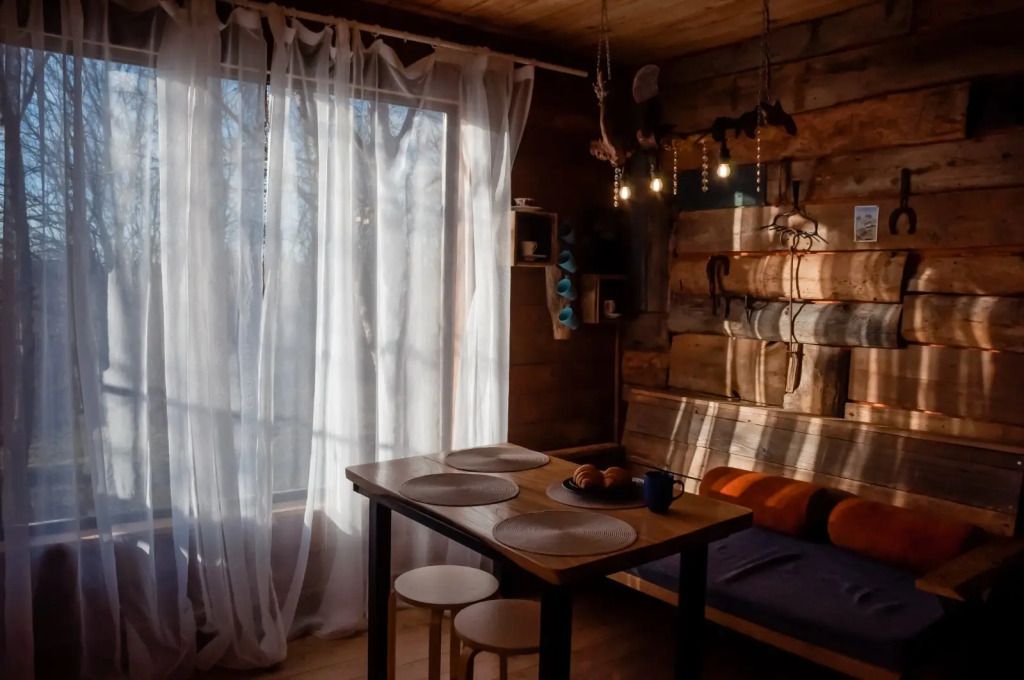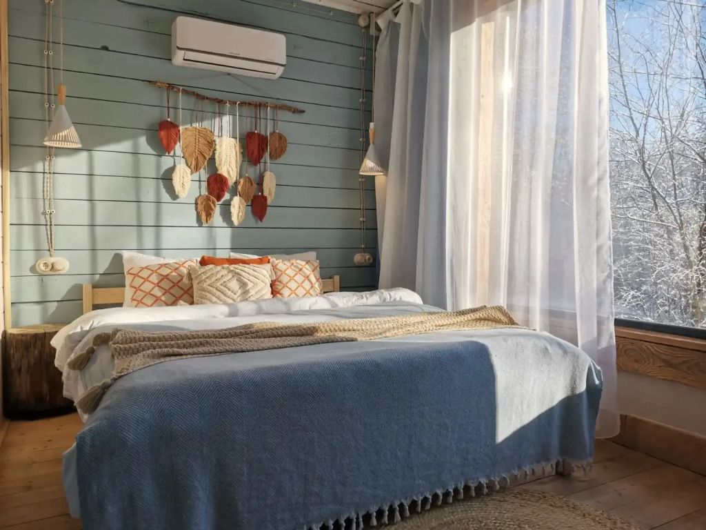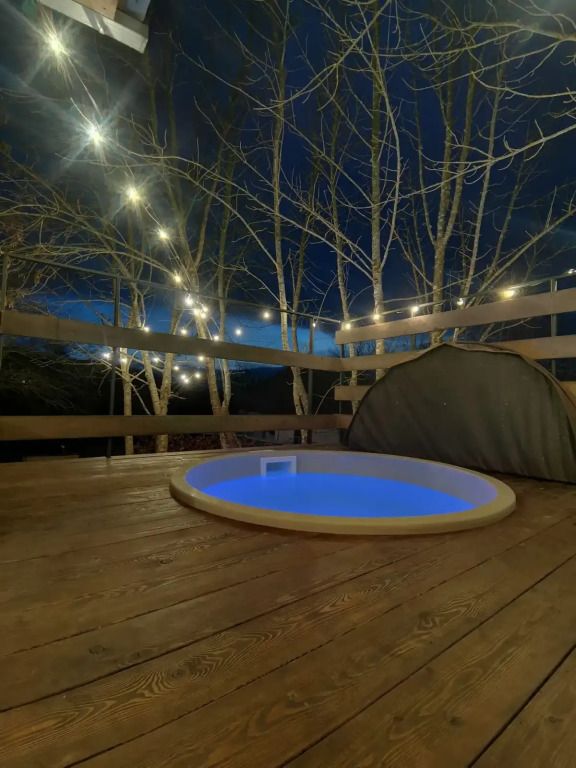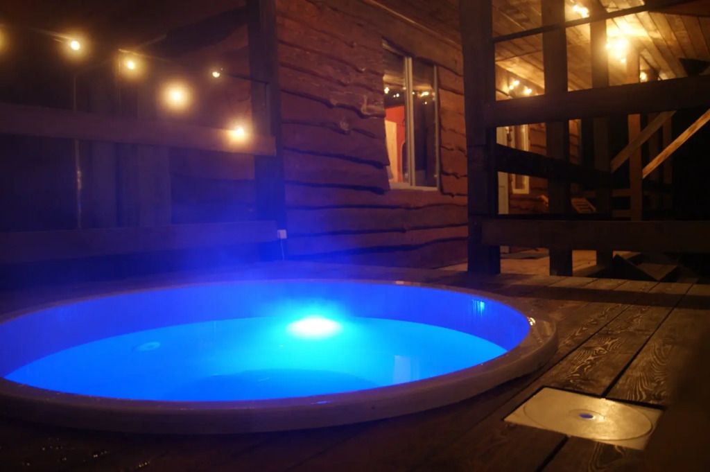 Круглосуточно доступна горячая купель 38°С с гидромассажем и подсветкой. В глэмпинге панорамные окна, есть каминная печь и сатиновое постельное бельё.