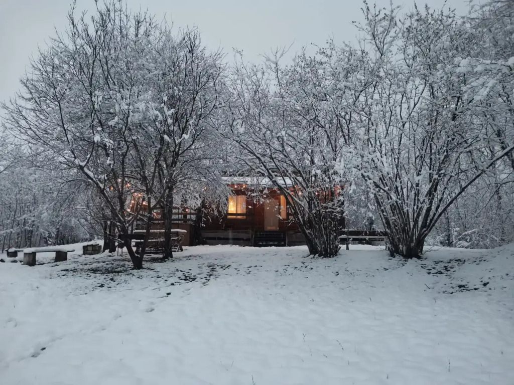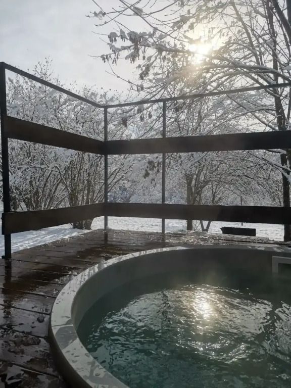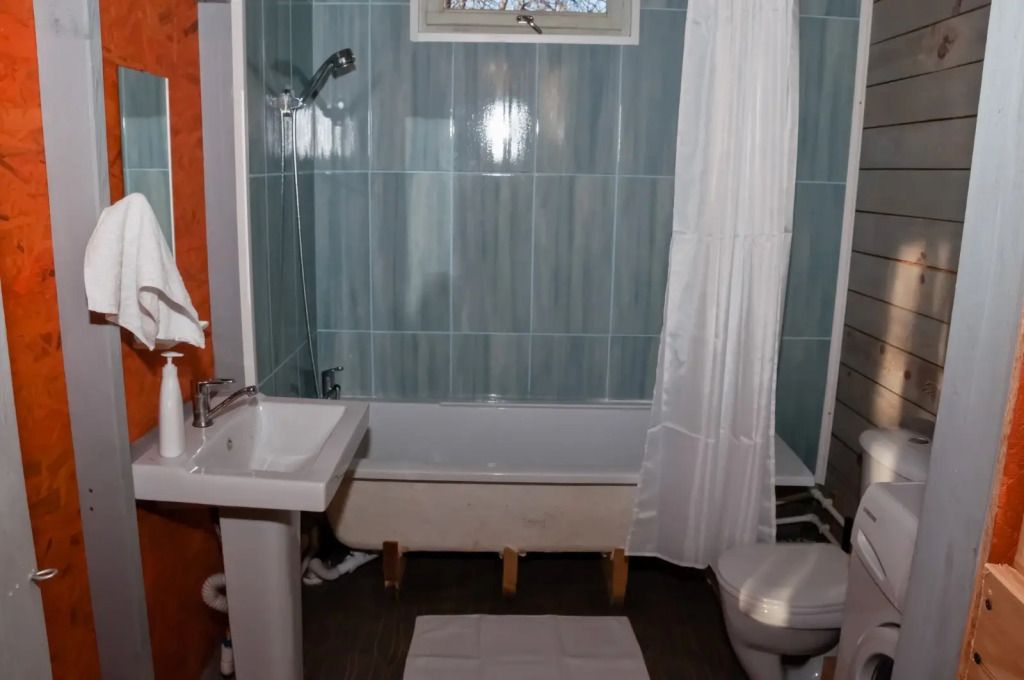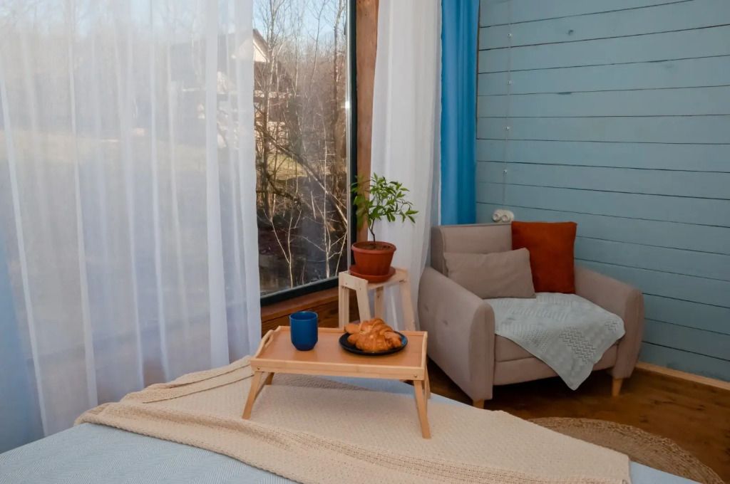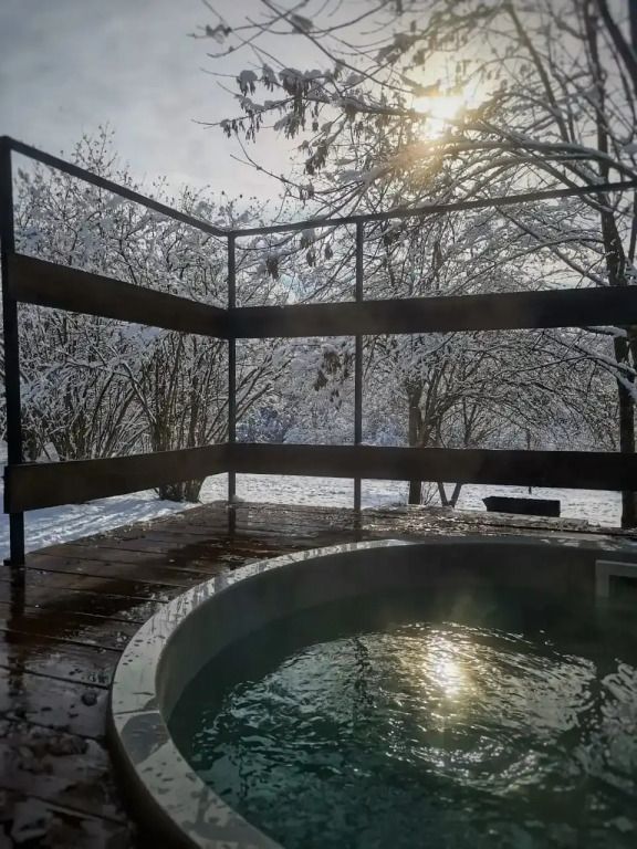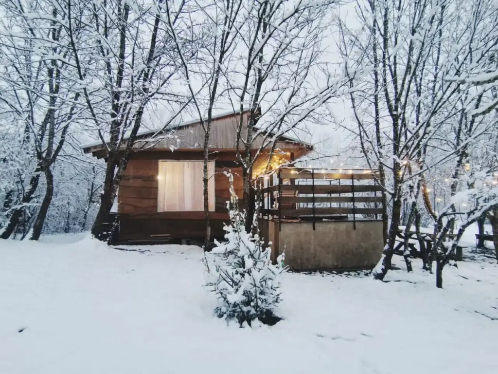 Круглосуточно доступна горячая купель 38°С с гидромассажем и подсветкой. В глэмпинге панорамные окна, есть каминная печь и сатиновое постельное бельё.