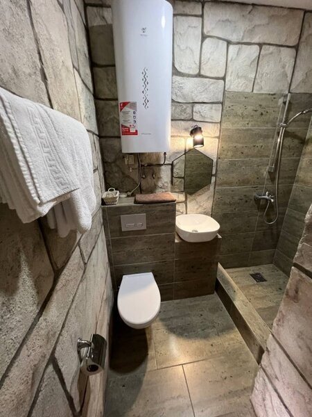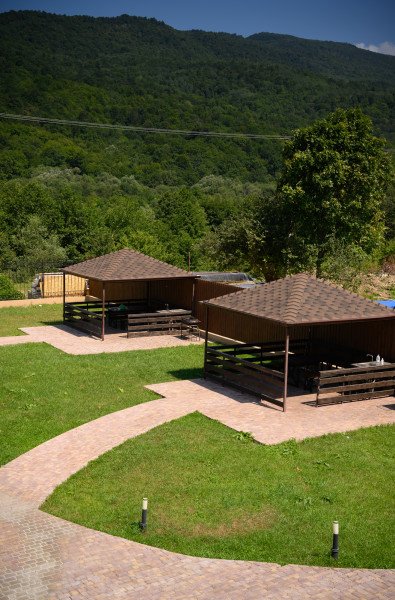 Также на территории имеется 4 оборудованные зоны барбекю, терраса с посадочными местами, работает ресторан. Действует бесплатный Wi-Fi в зоне кафе и номерах категории комфорт. В распоряжении гостей открытый подогреваемый до комфортной температуры бассейн с потрясающим видом на горы.