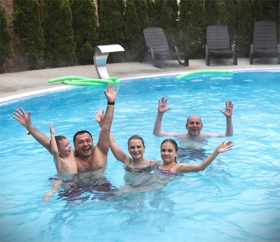 Бассейн очень тёплый, рядом есть сауна-что очень удобно при отдыхе с ребёнком, который может погреться после купания и опять продолжать купаться))