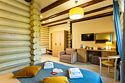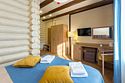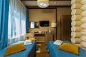 В номере: двуспальная кровать 180х200, двухместный диван-кровать (раскладывается при оплате дополнительного места), евро-раскладушка с ортопедическим матрасом (предоставляется при оплате дополнительного места), гардероб, зеркало, комод, обеденный стол со стульями, кресло, письменный стол, стул, пуф, журнальный стол, 2 телевизора, мини-холодильник, сейф, чайная станция, чай, кофе, бутилированная вода, душ, туалет, халаты, тапочки, комплект полотенец для номера и для бассейна, фен, косметические принадлежности итальянского производства (шампунь, кондиционер, гель для душа, лосьон для тела, мыло, зубной набор, шапочка для душа, расческа). Дети 0-5 лет могут размещаться без доп. места. Одновременно в номере могут размещаться максимум 2 ребенка 0-5 лет без предоставления доп. места. Детская кроватка-манеж предоставляется бесплатно по запросу. Завтрак без доп. места предоставляется для детей в возрасте 1-5 лет. Максимально возможная вместимость номера: 1) 4 гостя + 2 ребенка до 6 лет без доп. места; 2) 5 гостей + 1 ребенок до 6 лет без доп. места;Услуги и удобства