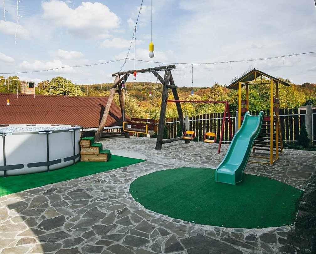 На территории гостевого дома имеется сезонный бассейн и уютная зона для барбекю среди изумрудного сада. Для юных гостей оборудована детская площадка с качелями и горкой. Любители активного отдыха могут воспользоваться услугами экскурсионного бюро и отправиться в увлекательные поездки по живописным окрестностям.