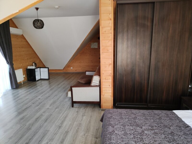 Трехэтажный корпус отеля выстроен в виде классического альпийского шале. В распоряжении гостей 17 номеров разных категорий комфорта. В каждом предусмотрены индивидуальные удобства, есть сплит-система, электрочайник, телевизор, в большинстве комнат предусмотрены меблированные балконы или террасы с видом на горы.