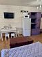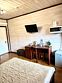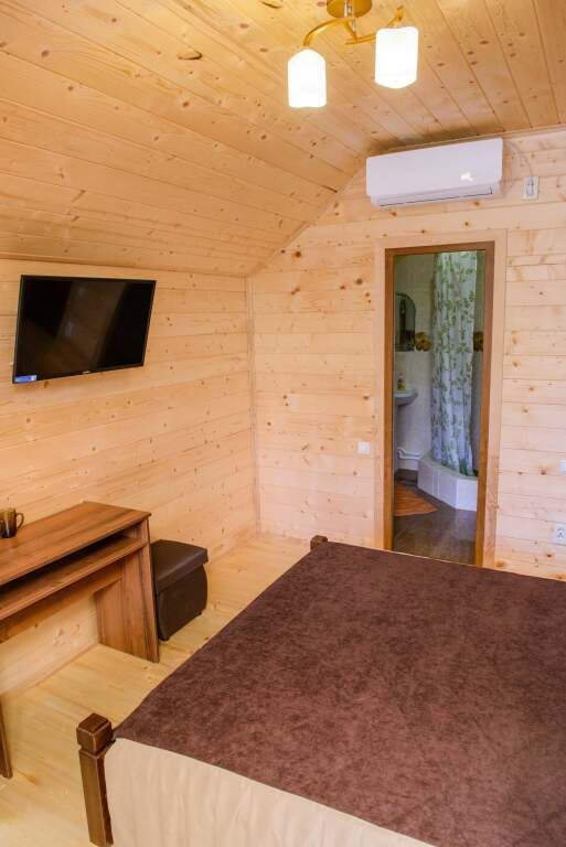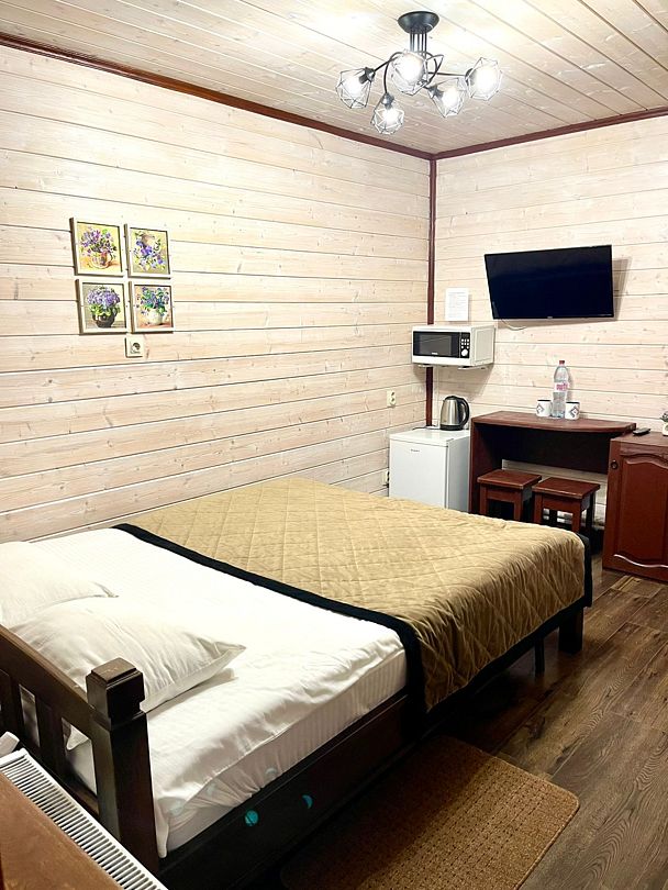 Номер оснащён 1 двуспальной кроватью, душевой кабиной, собственной ванной комнатой, шкафом, вешалкой для одежды, столом, стульями, телевизором, кондиционером, сушилкой для белья, так же имеются столовые приборы, посуда, СВЧ, электрический чайник, холодильник, фен и ванные принадлежности (полотенца, мыло).