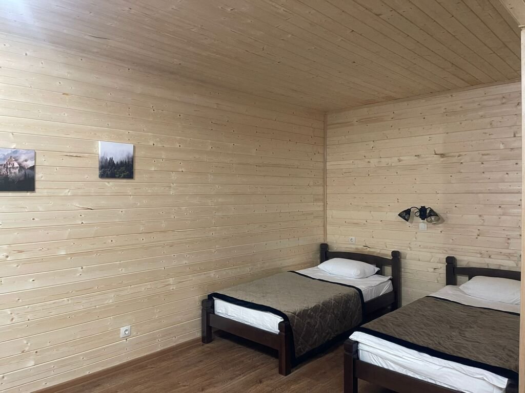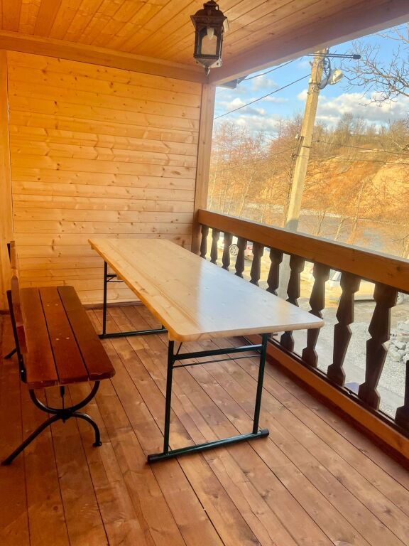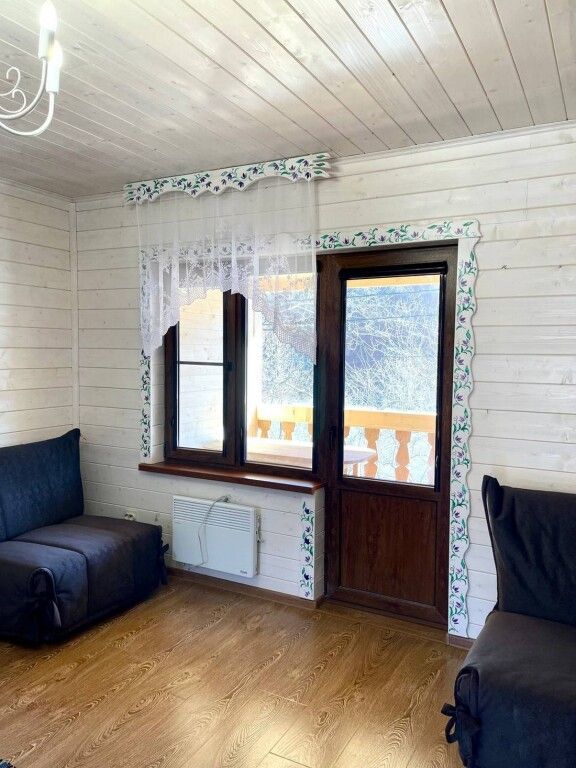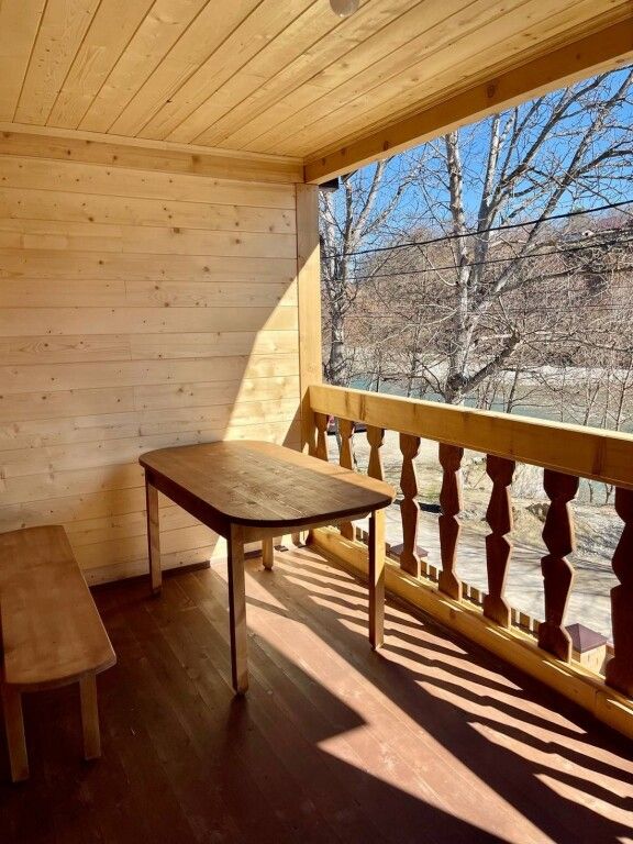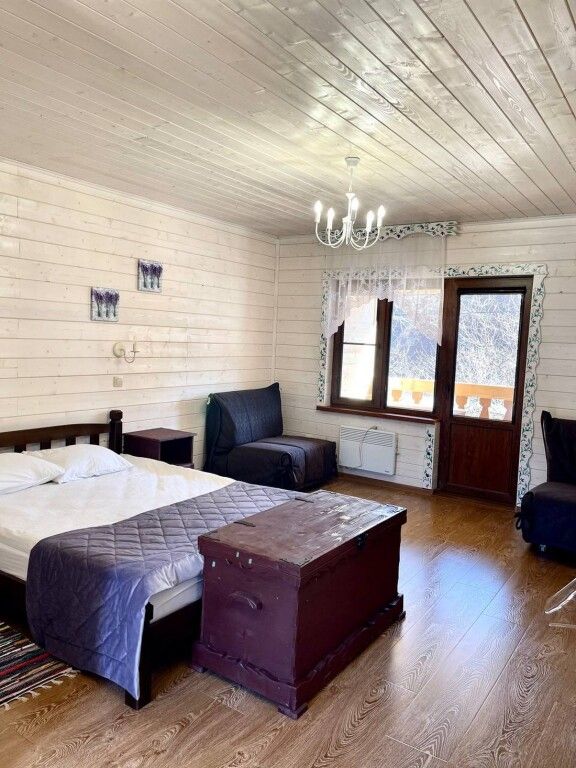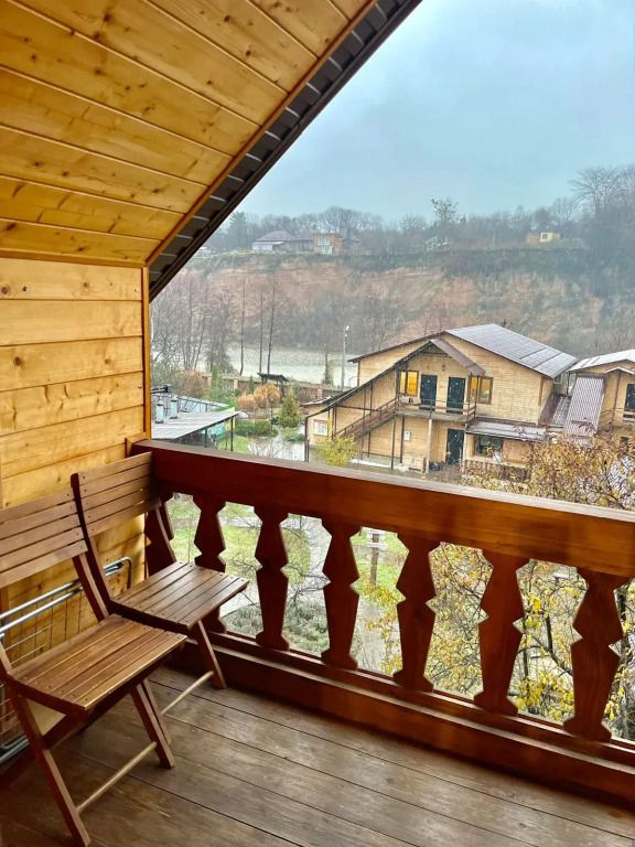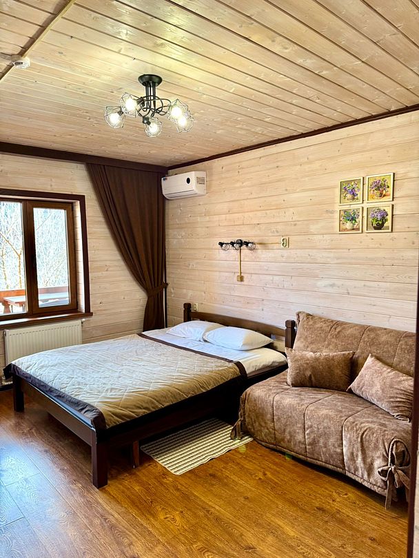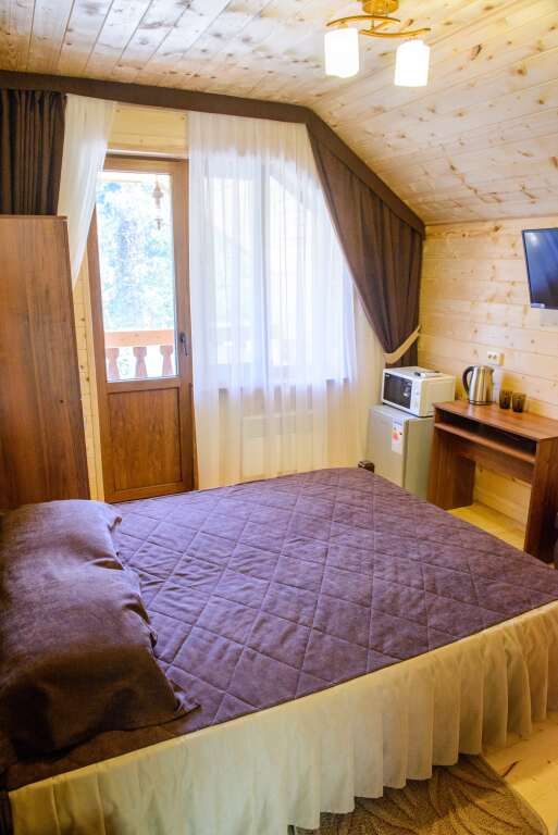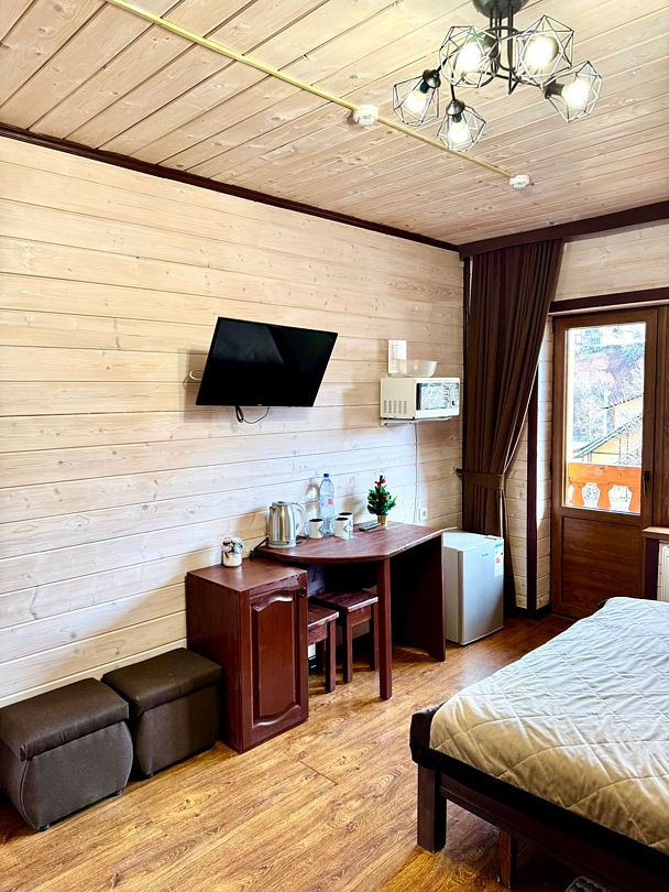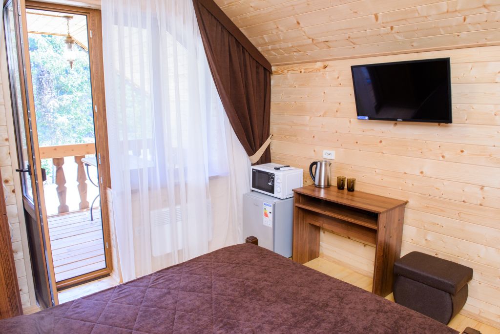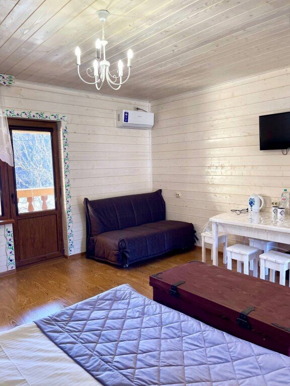 В номерах имеется: двуспальная кровать, двуспальный диван, раскладное кресло, прикроватные тумбочки, стол, стулья, шкаф, вешалки для одежды, отдельный санузел (душ, раковина, унитаз, фен, шампунь, мыло, гель для душа), сушилка для белья, кондиционер, СВЧ, чайник, посуда, холодильник, телевизор, балкон со столом и лавкой. Вид на реку и горы.