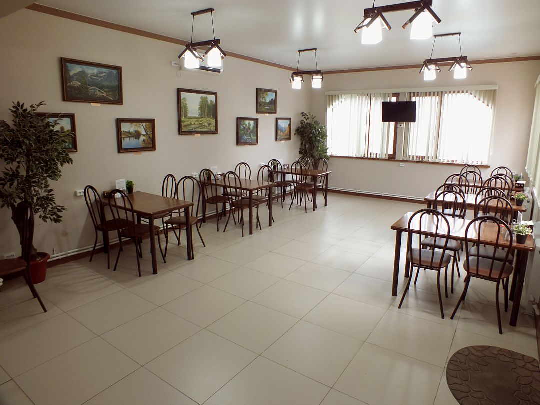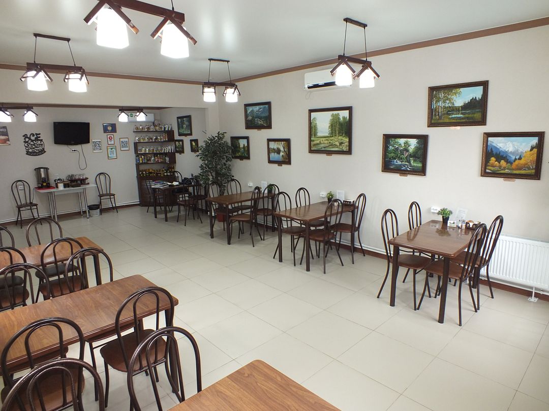 Кафе гостевого дома с уютным дизайном, телевизором и небольшой картинной галереей региональных художников, распахивает свои двери каждое утро для вкусных домашних завтраков, сразу с печи. Завтраки заказываются по меню. За дополнительную плату можно заказать обеды и ужины по предложенному меню и в назначенный час аппетитная домашняя еда будет ждать только Вас. Также есть возможность аренды зала и посуды для проведения торжественных мероприятий за дополнительную плату.