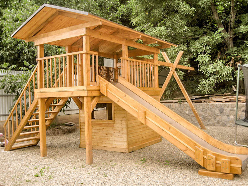 Детская площадка с домиком, горкой, качелями и батутом.