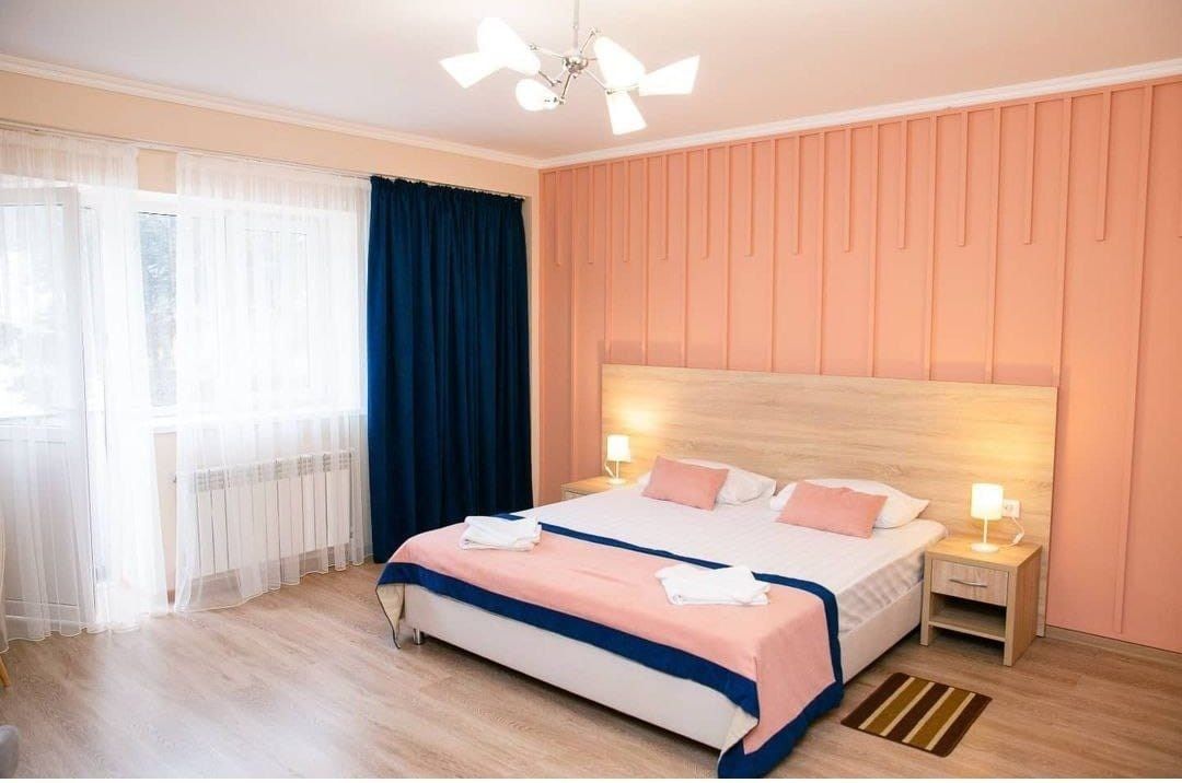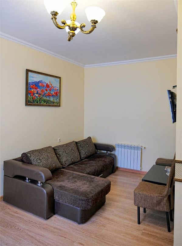 Современный номер с одной двуспальной кроватью и раскладным диваном. Выполнен в приятных ярких тонах. Номер, в котором отдыхающим будет очень комфортно. С балкона жилой комнаты открывается сказочный вид на горный пейзаж.Услуги и удобства