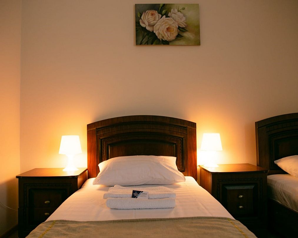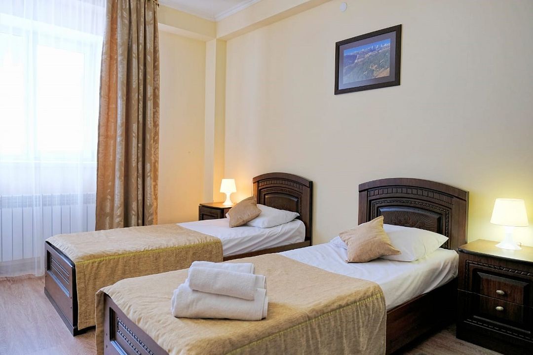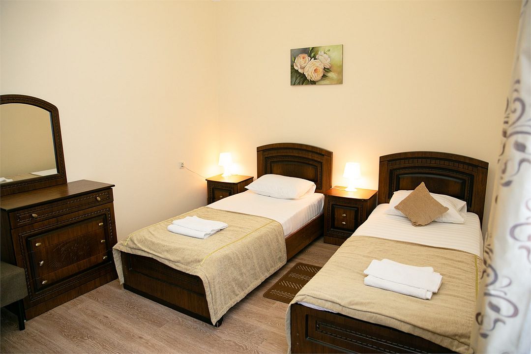 Уютный номер оборудован всем необходимым для комфортного проживания 1-2-х человек. В номере 2 односпальные кровати, по желанию гостей туристического комплекса, сдвинув, можно превратить в односпальное место. Состоит из жилой комнаты и санузла. Лучший вариант для путешественников, которым важно соотношение цены и качества.Услуги и удобства
