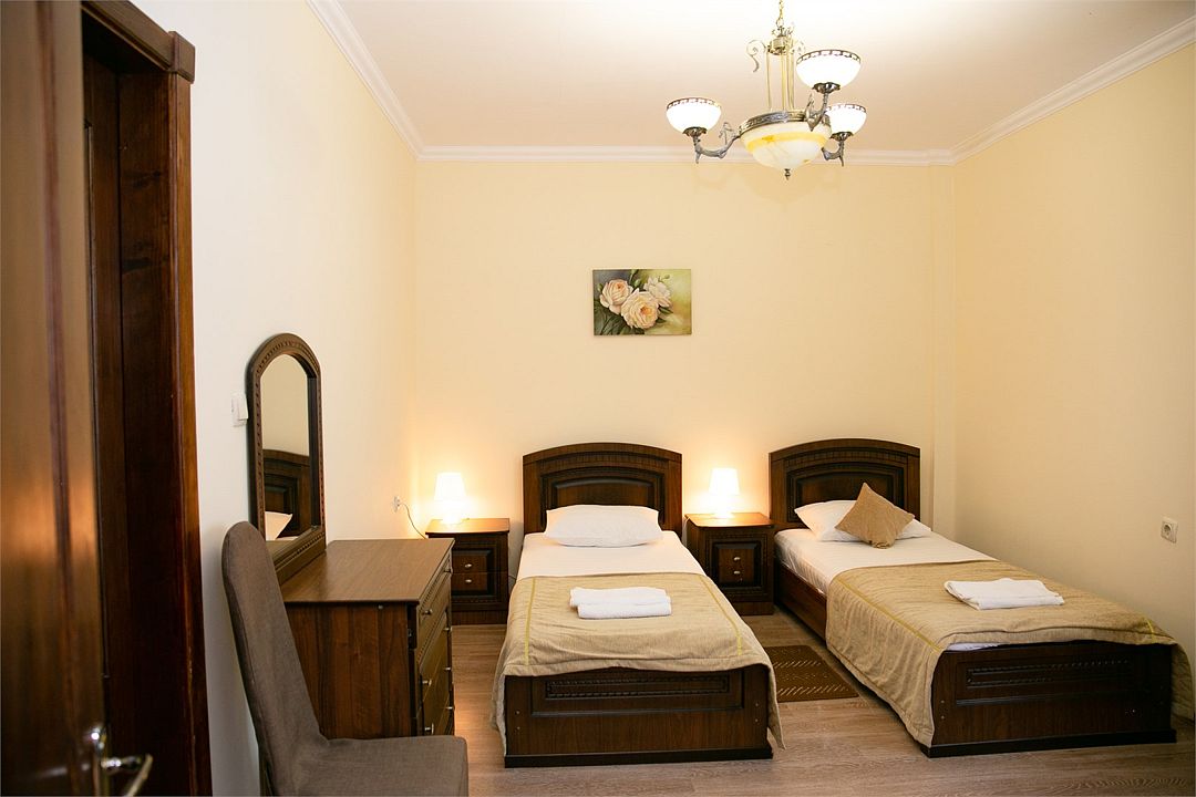 Просторная жилая комната номера оборудована двумя односпальными кроватями. Имеется дополнительное спальное место. В ванной комнате установлена современная душевая кабина. Интерьер комнаты, выдержанный в спокойных классических тонах.Услуги и удобства