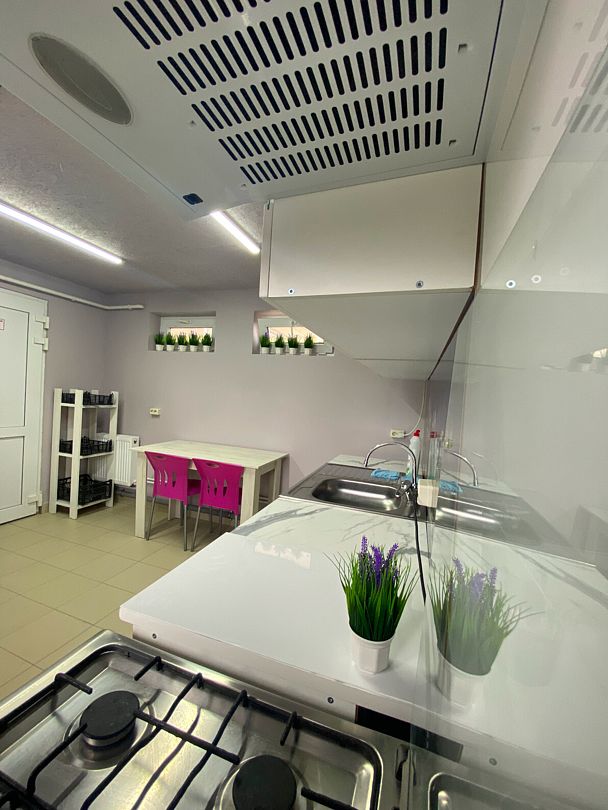На кухне общего пользования есть: микроволновая печь, газовая плита, раковина, набор посуды для самостоятельного приготовления пищи.