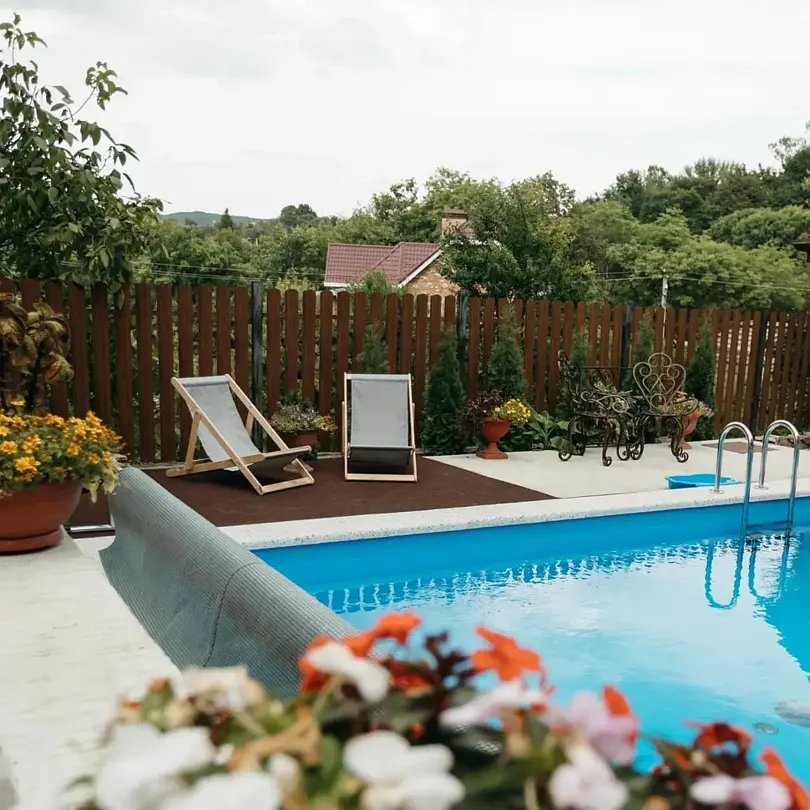 Большой бассейн с постоянной фильтрацией воды и лаунчж зона с шезлонгами для загара и отдыха. Это отличное место чтобы взбодриться сутра или освежиться после активного дня под ярким июльским солнцем.