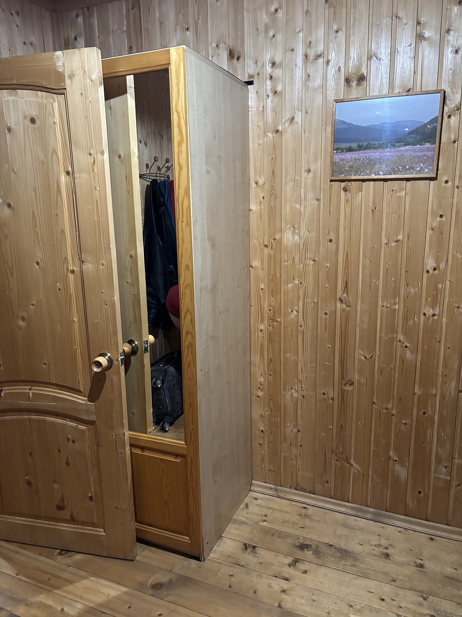 В спальне удобная двуспальная кровать (при необходимости кровать можно разделить на две раздельные), вешалки и полочки для хранения вещей.
