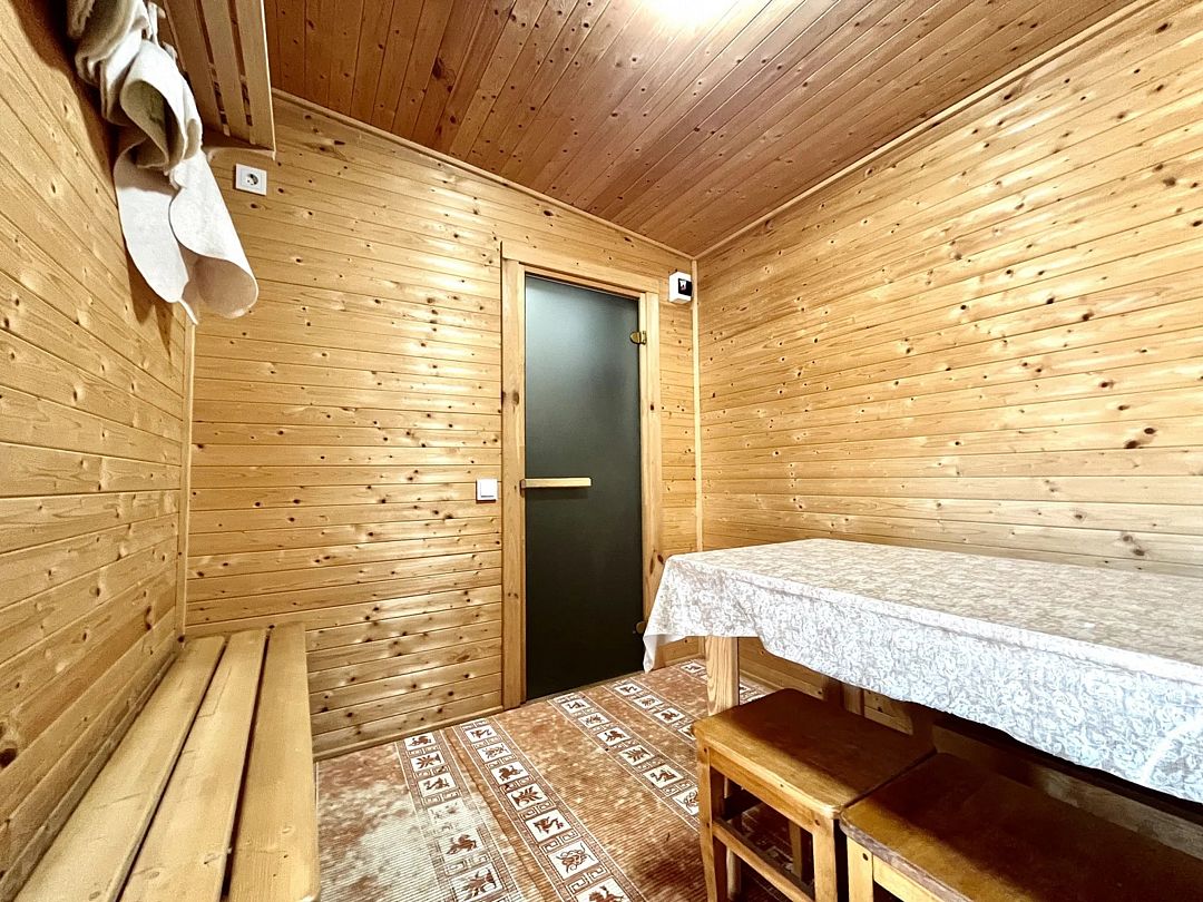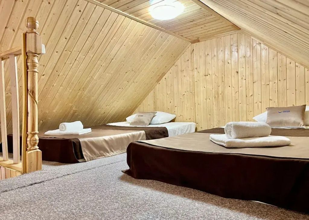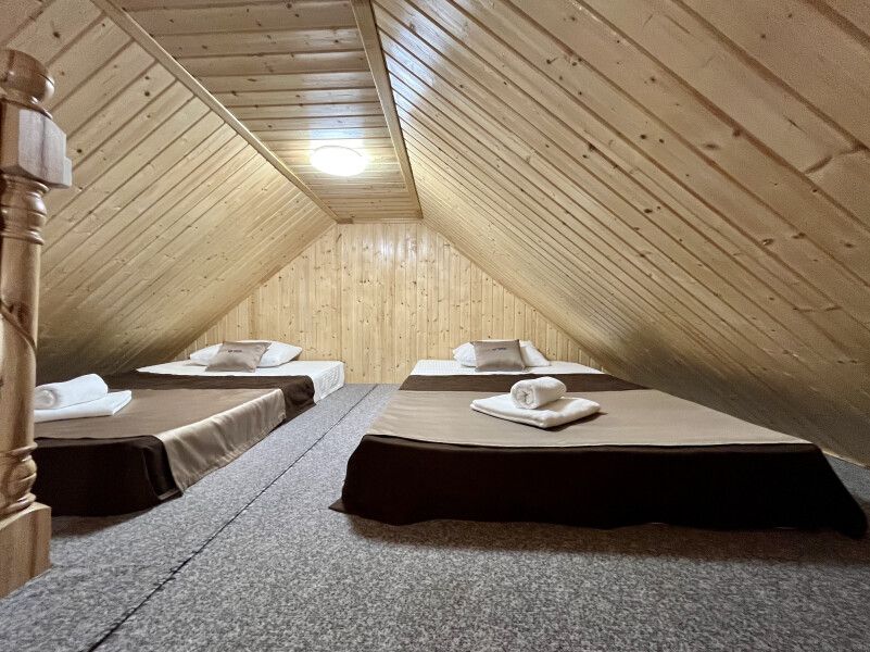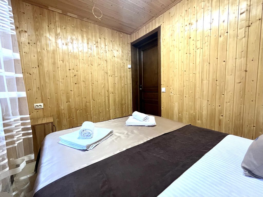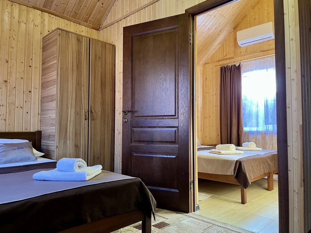 Уютный 2-хкомнатный бревенчатый дом состоит из спальни с двумя 2-хспальными кроватями, ванной комнаты с душевой кабинкой, бесплатными косметическими принадлежностями (шампунь, мыло, гель), феном.