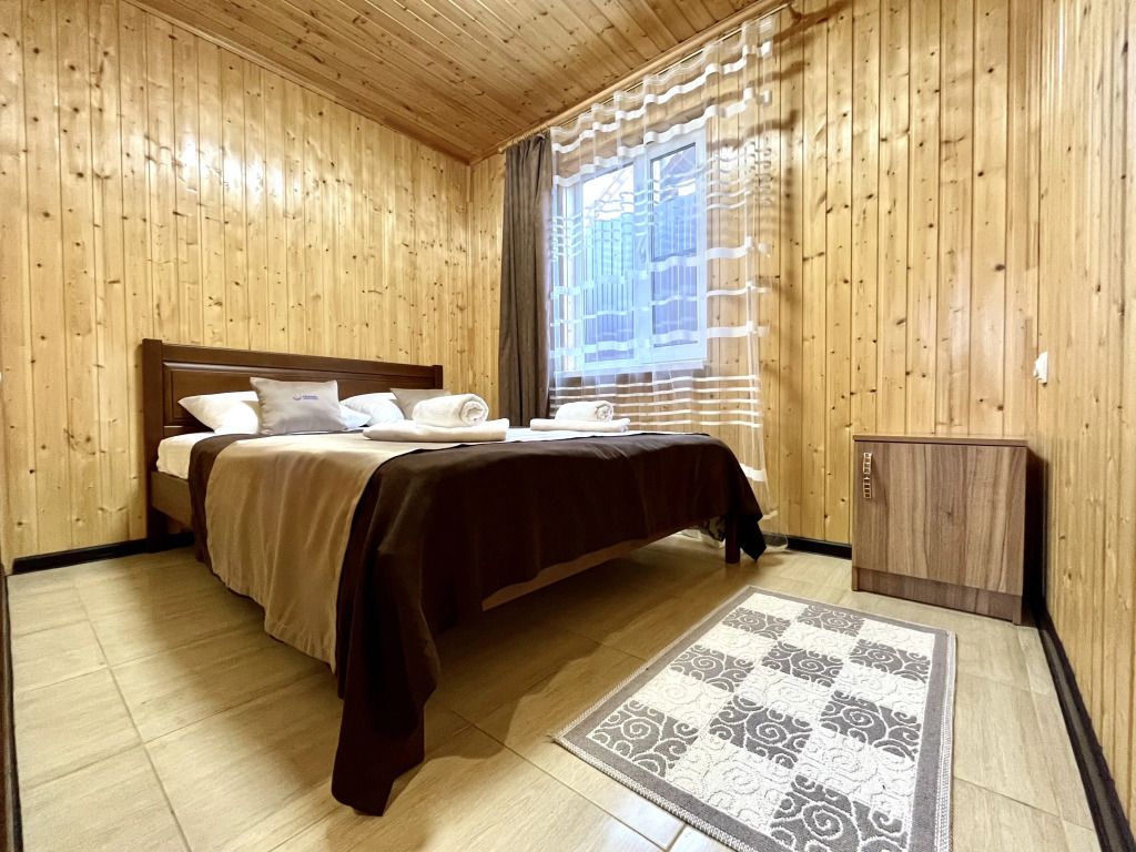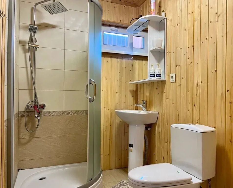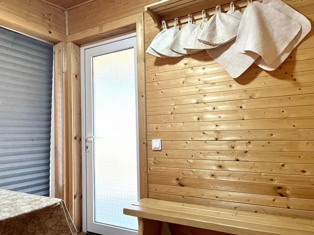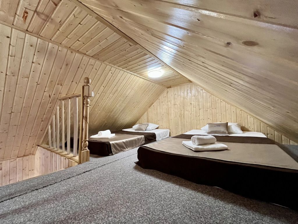 Уютный 2-хкомнатный бревенчатый дом состоит из спальни с двумя 2-хспальными кроватями, ванной комнаты с душевой кабинкой, бесплатными косметическими принадлежностями (шампунь, мыло, гель), феном.