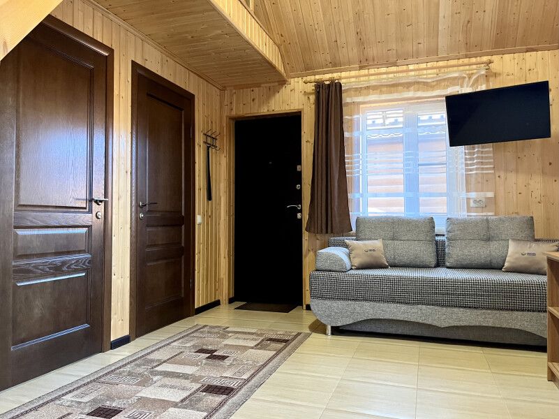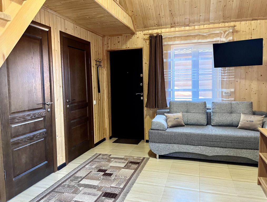 Уютный 2-этажный бревенчатый дом состоит из спального лофта, двух спален и гостиной зоны с раскладным диваном.