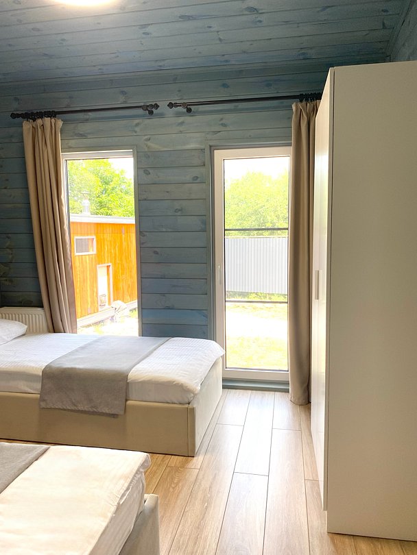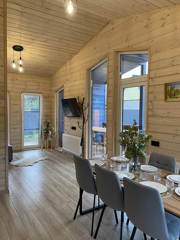 В доме: 2 отдельные спальни по 14 кв. м., одна кровать 180 см и 2 кровати по 90 см; раскладной диван размером 180 см. Просторная гостиная 27 кв. м. и кухня с обеденным столом на 7 человек. Два санузла.