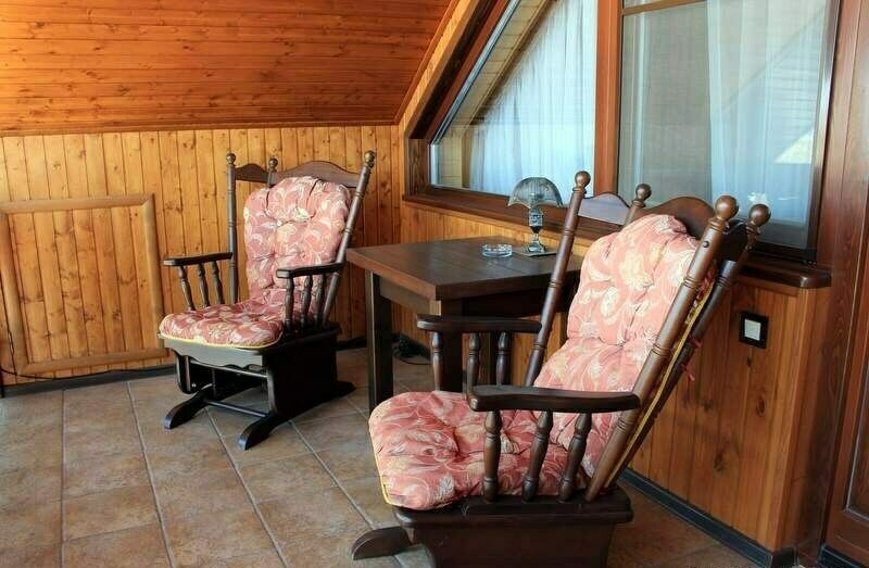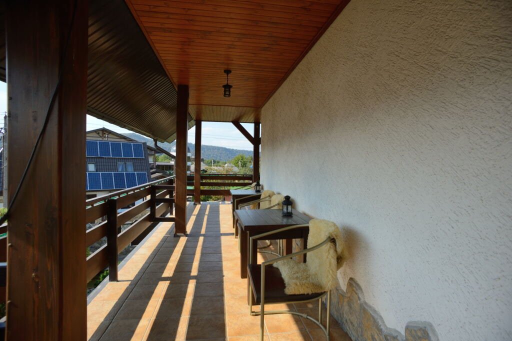 Гостевой дом — это 3-х этажное здание, построенное в стиле «Шале» общей площадью 390 кв. м. В гостевом доме 5 комфортабельных номеров с удобными просторными балконами для отдыха. Номера расположены на втором и третьем этажах. На первом этаже уютный обеденный зал с камином на 12 посадочных мест.