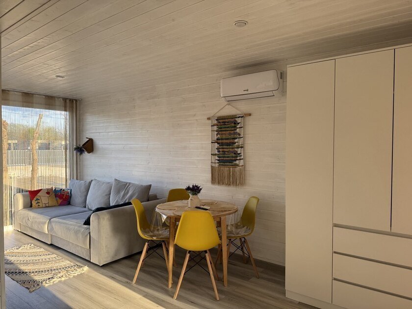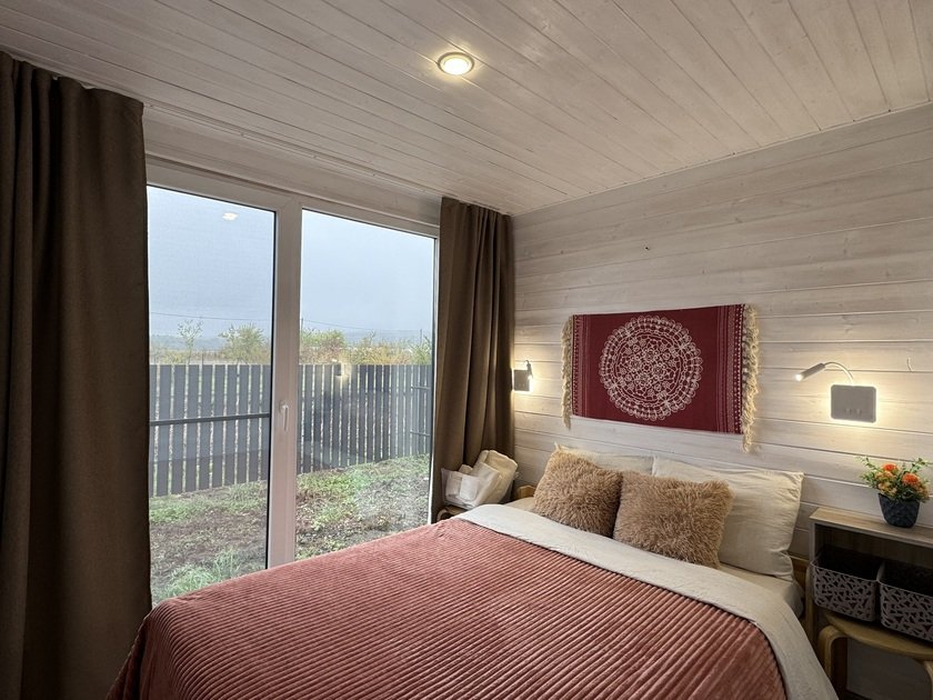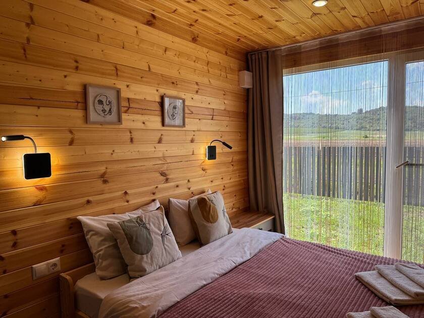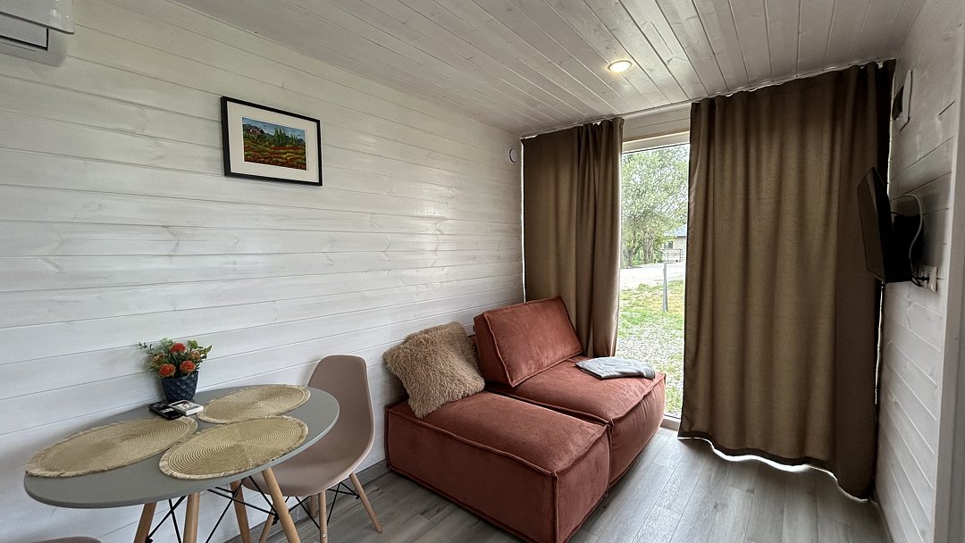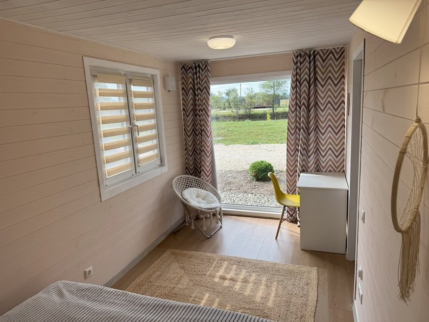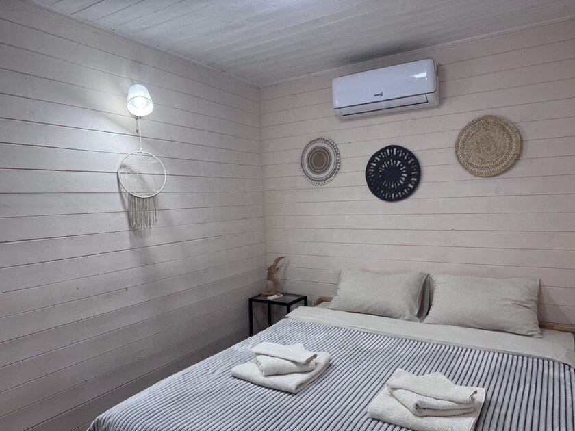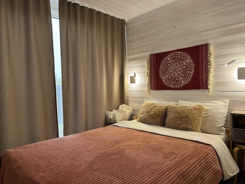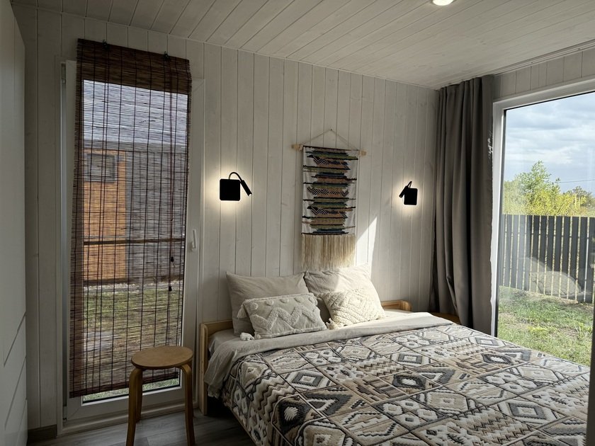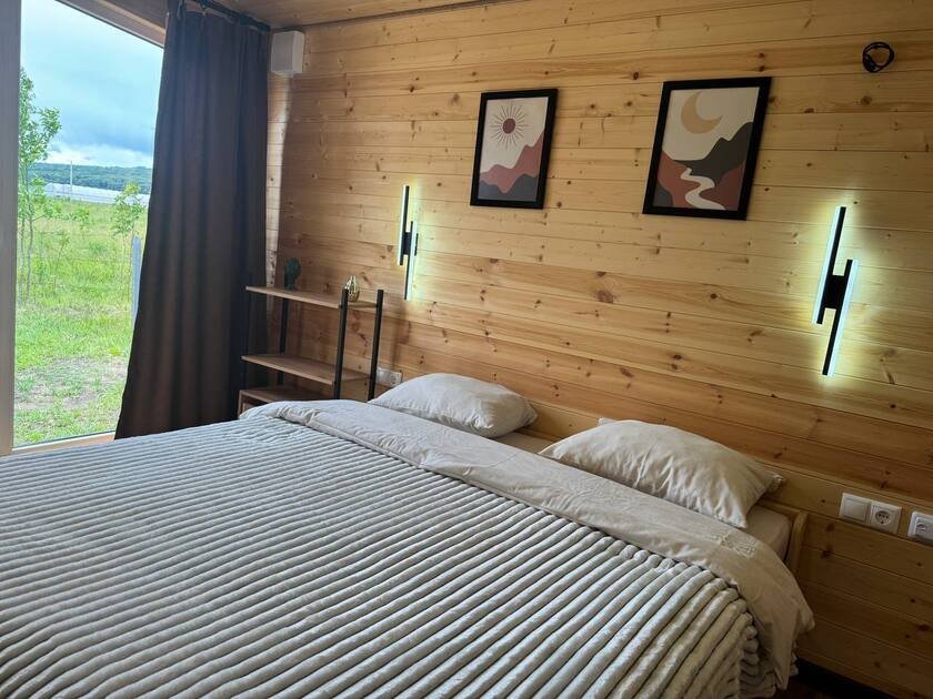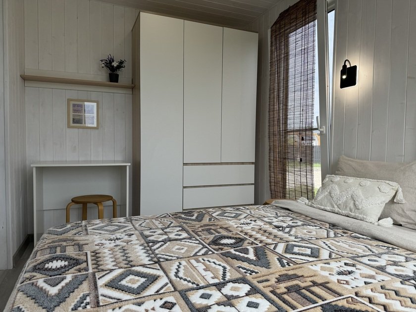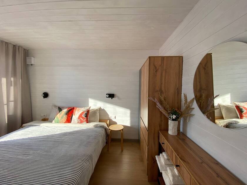 Дом для отдыха на четверых — идеальное решение для комфортного семейного отпуска или путешествия небольшой компанией друзей. Спальная комната оснащена двуспальной кроватью и шкафом для вещей, рабочим столом, есть возможность поставить детскую кроватку. Просторные окна пропускают много естественного света.