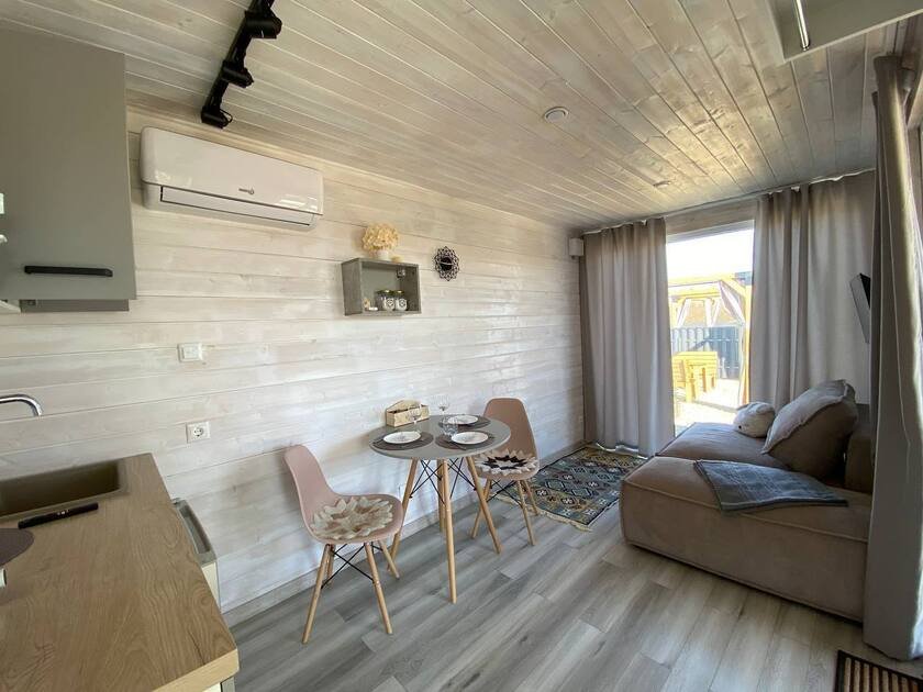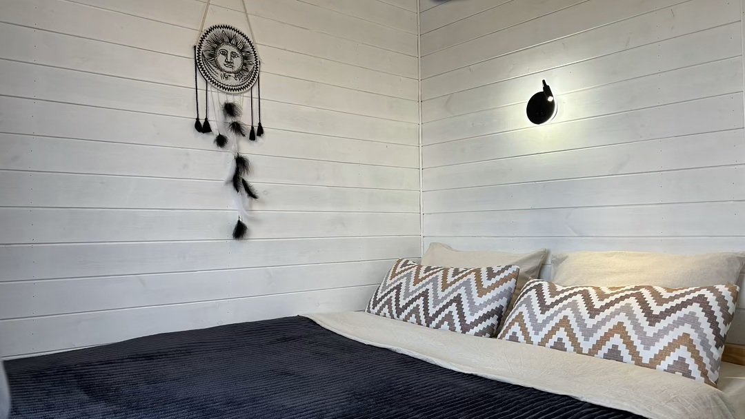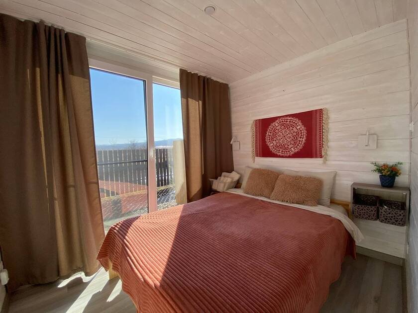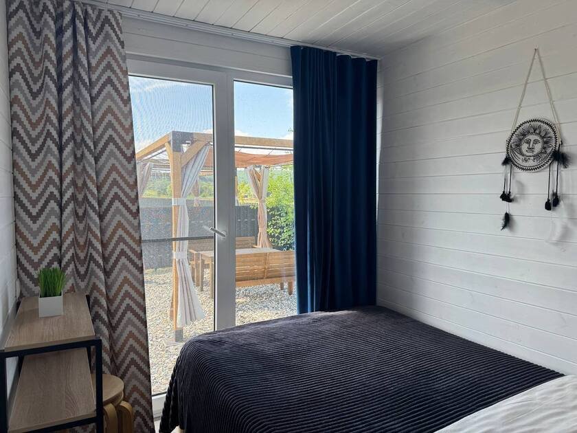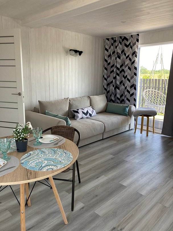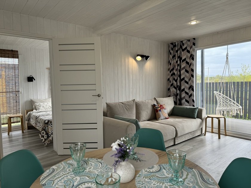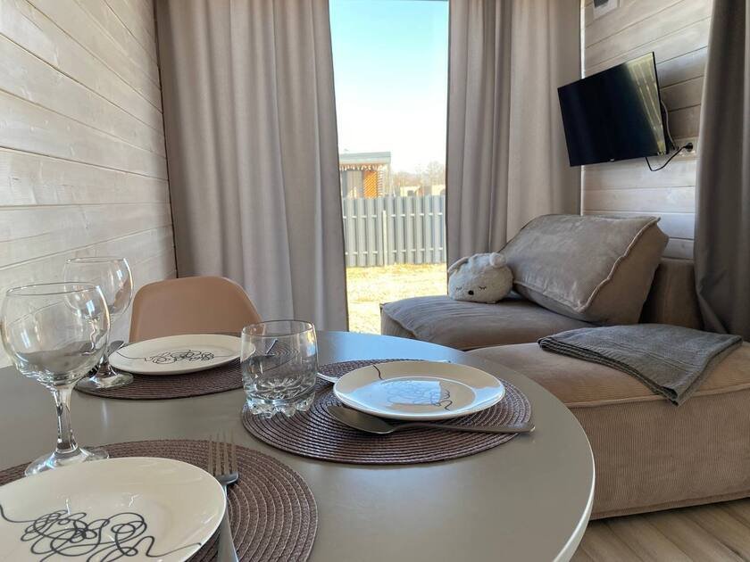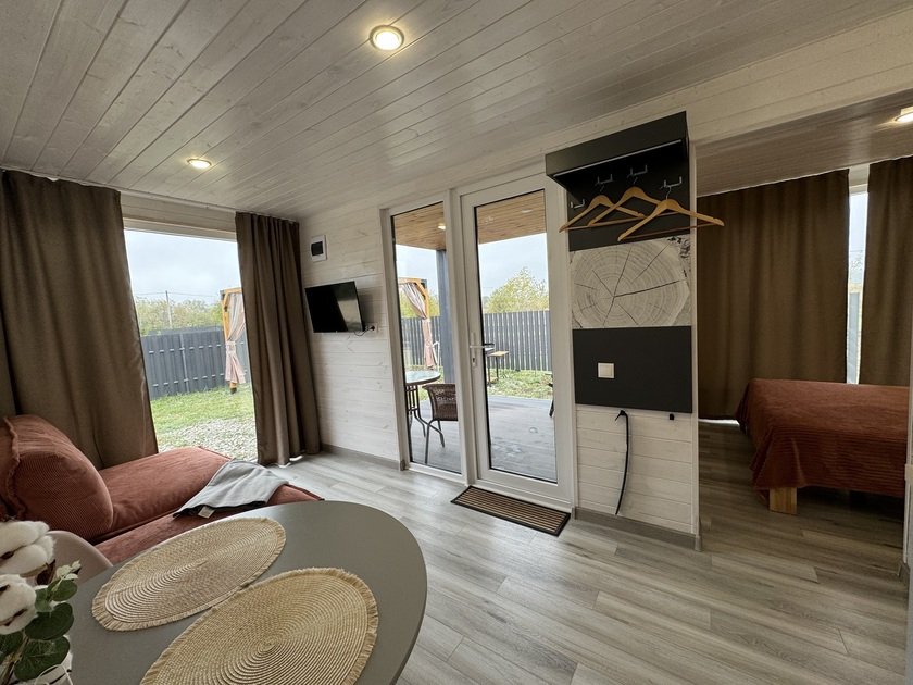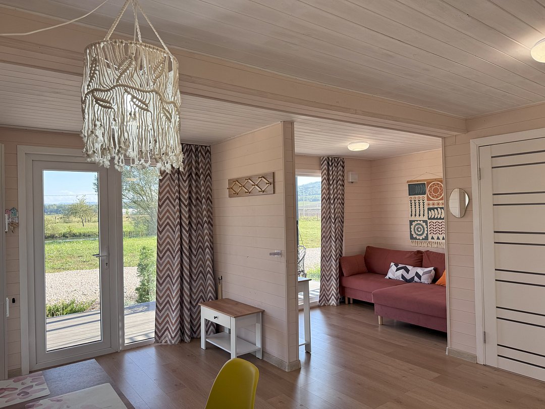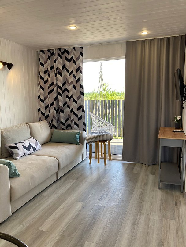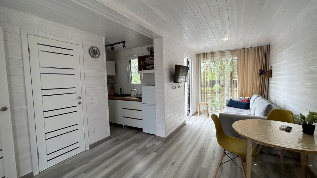 Дом для отдыха на четверых — идеальное решение для комфортного семейного отпуска или путешествия небольшой компанией друзей. Спальная комната оснащена двуспальной кроватью и шкафом для вещей, рабочим столом, есть возможность поставить детскую кроватку. Просторные окна пропускают много естественного света.