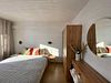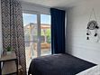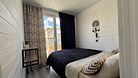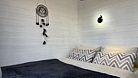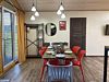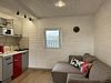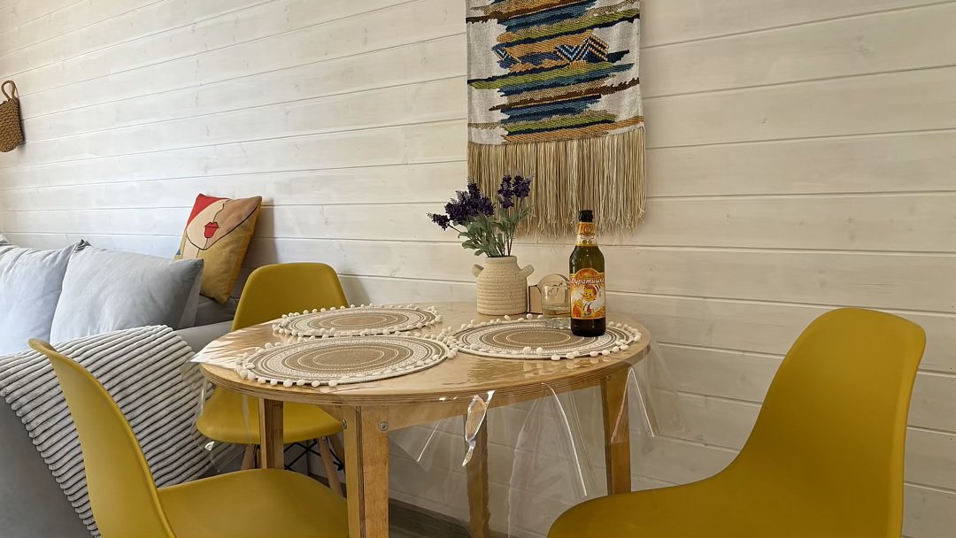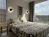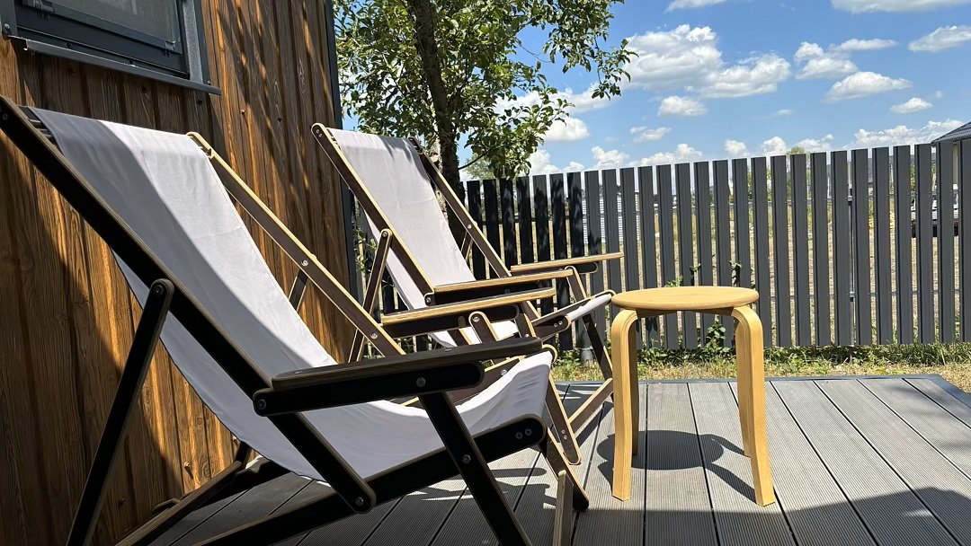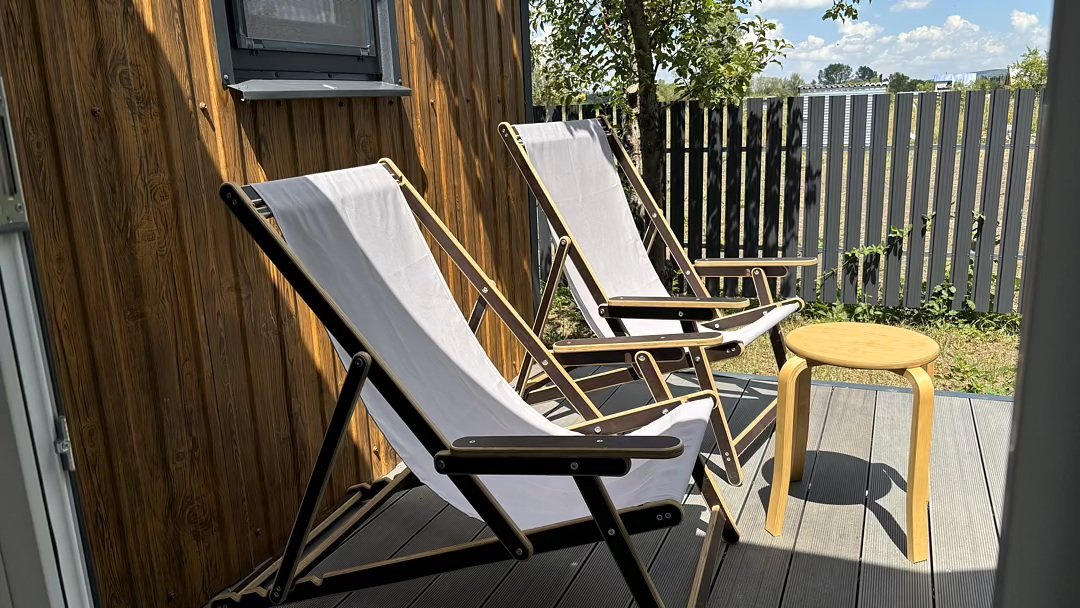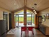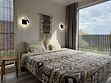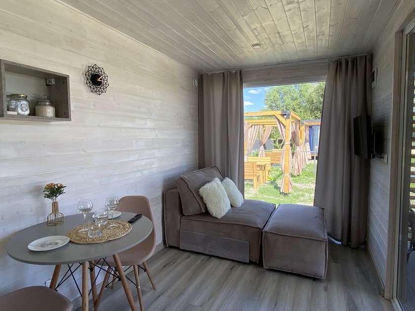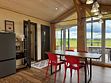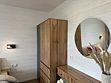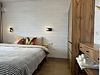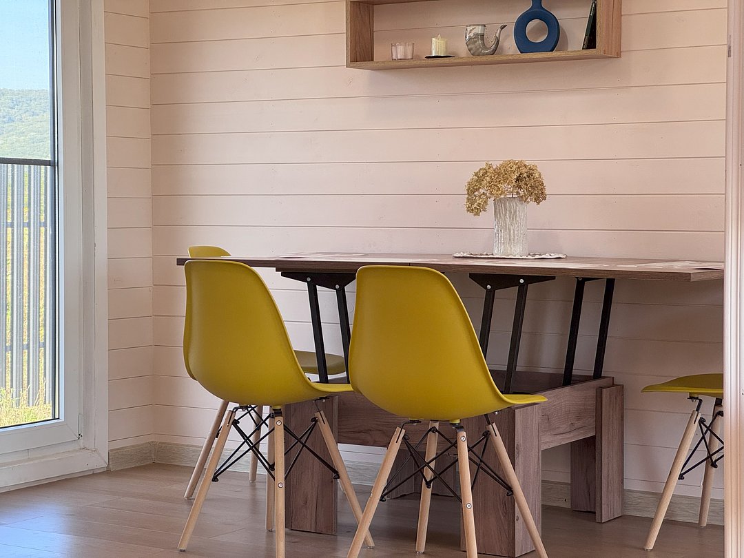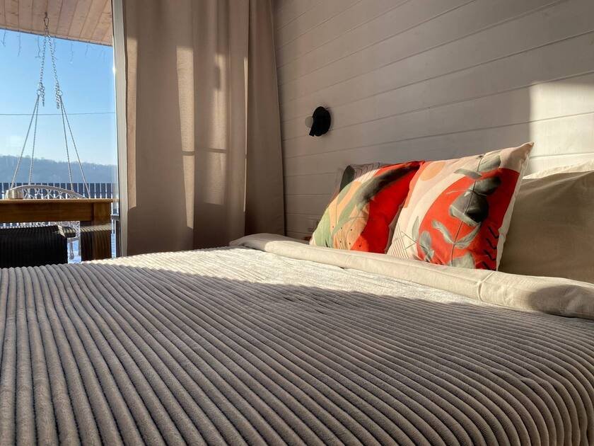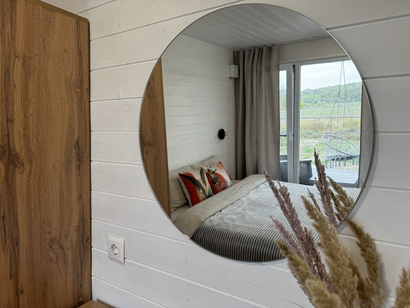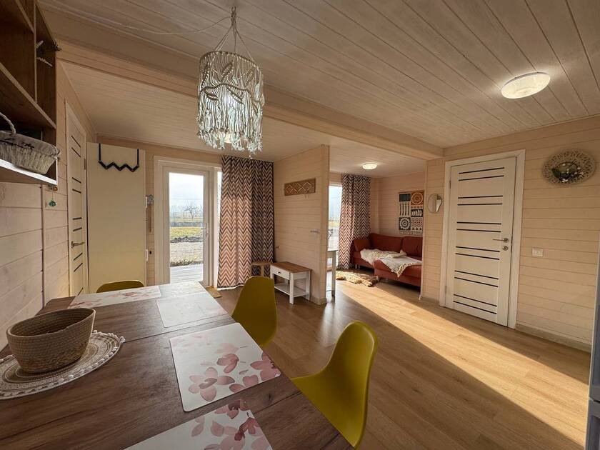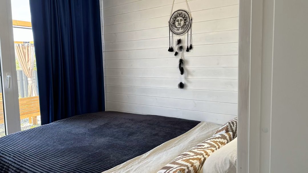 Дом для отдыха на четверых — идеальное решение для комфортного семейного отпуска или путешествия небольшой компанией друзей. Спальная комната оснащена двуспальной кроватью и шкафом для вещей, рабочим столом, есть возможность поставить детскую кроватку. Просторные окна пропускают много естественного света.