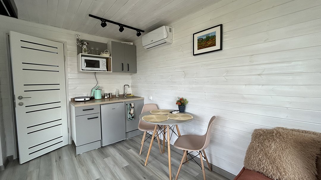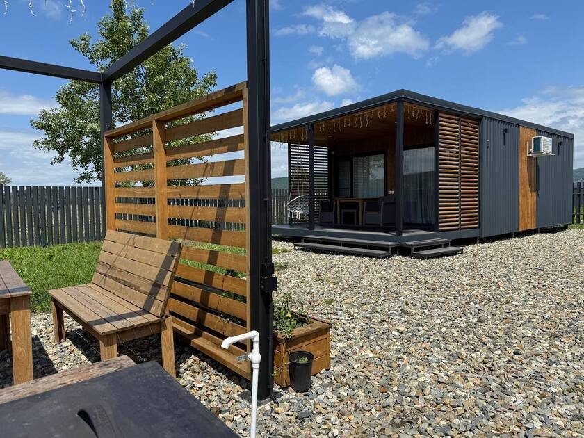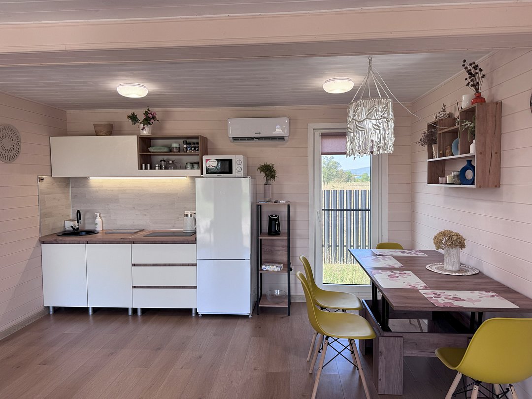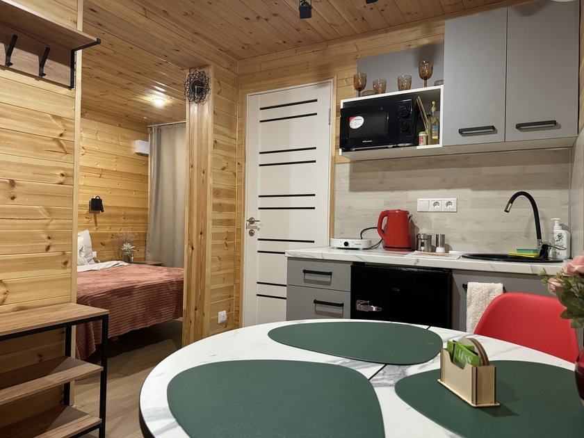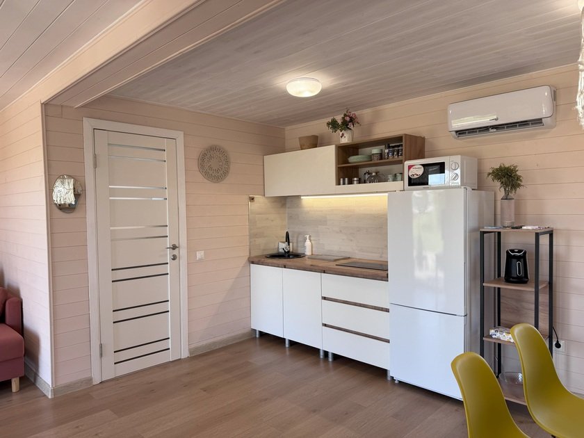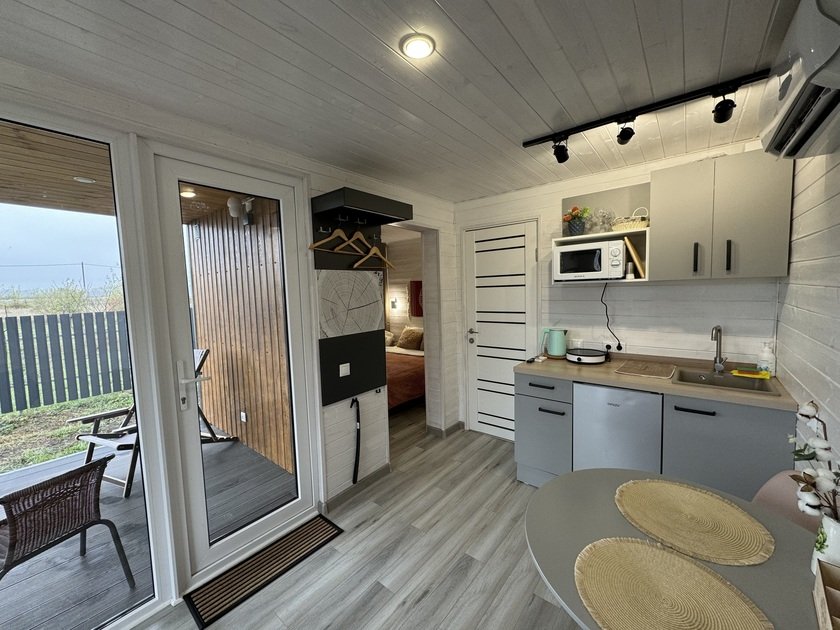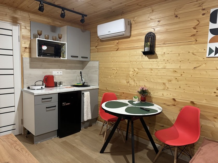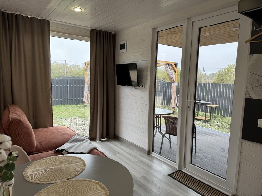 Собственная терраса. Собственная беседка и мангальная зона, парковка возле дома. Для вашего удобства в домике имеется холодильник, варочная индукционная плита, микроволновая печь, электрочайник, вся необходимая посуда, утюг, фен, цифровое TV, скоростной Wi-Fi. В холодильнике фермерские продукты.