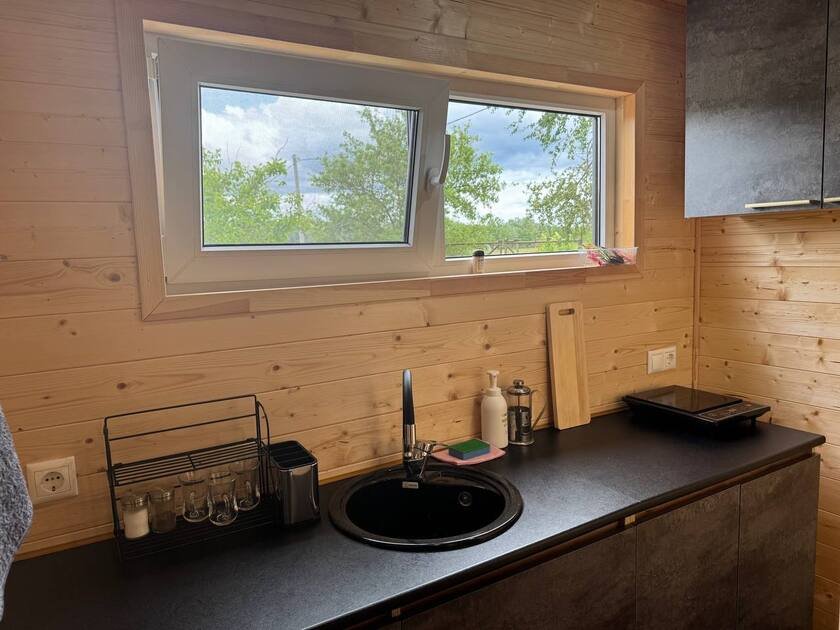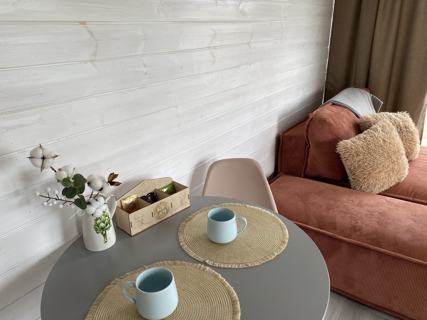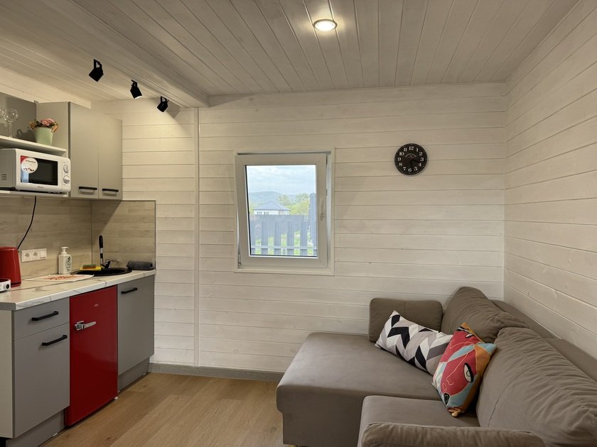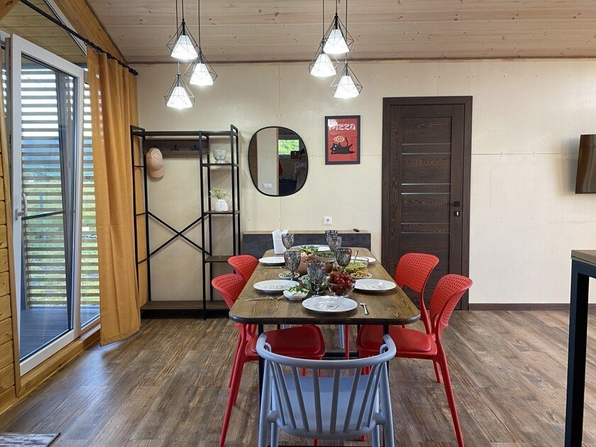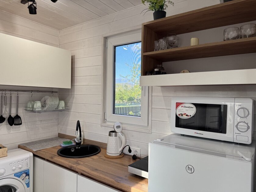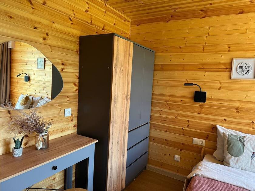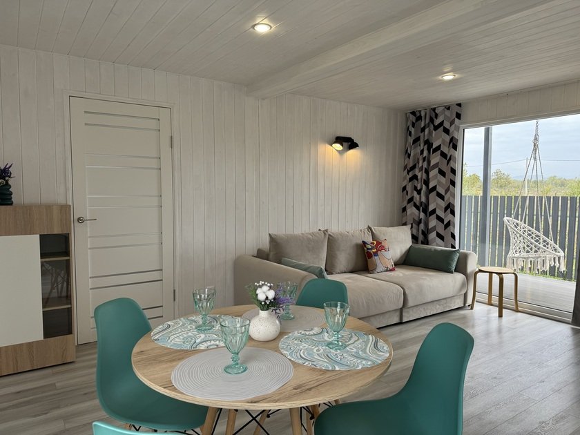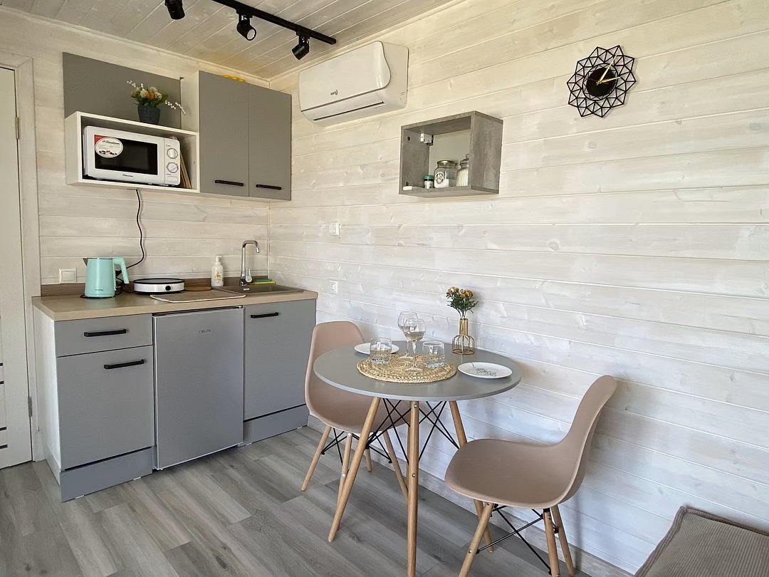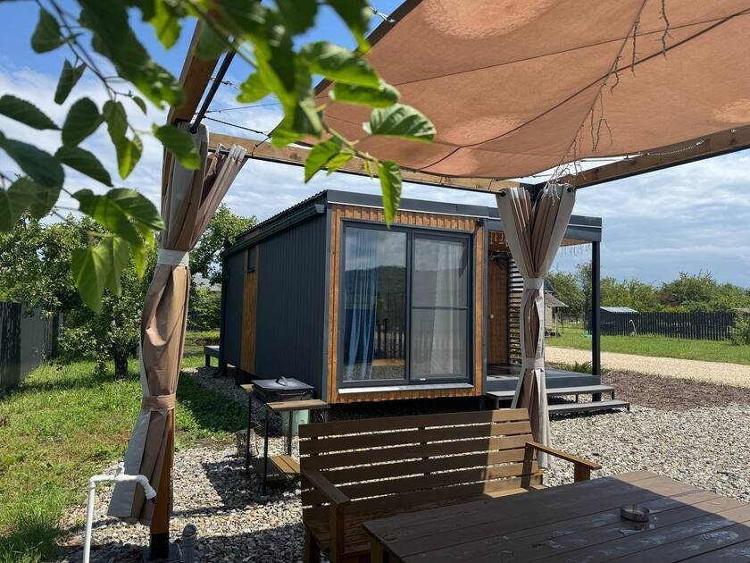 Собственная терраса. Собственная беседка и мангальная зона, парковка возле дома. Для вашего удобства в домике имеется холодильник, варочная индукционная плита, микроволновая печь, электрочайник, вся необходимая посуда, утюг, фен, цифровое TV, скоростной Wi-Fi. В холодильнике фермерские продукты.