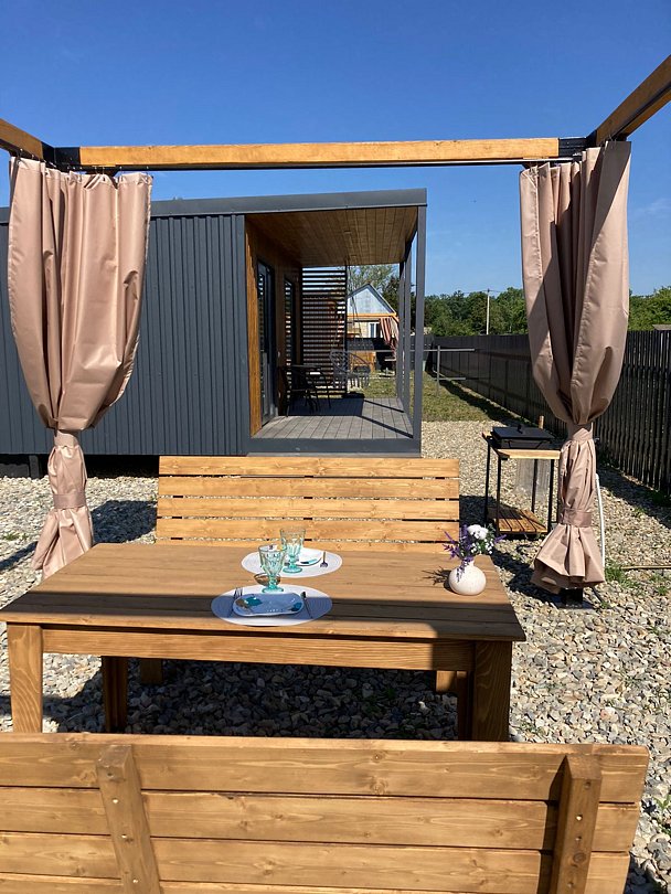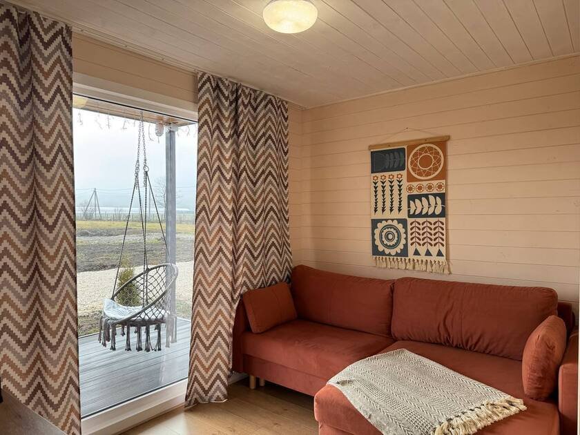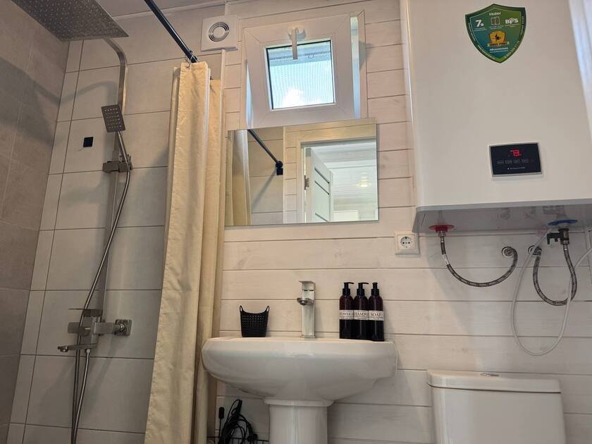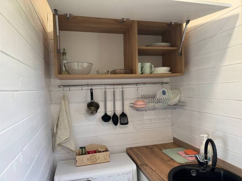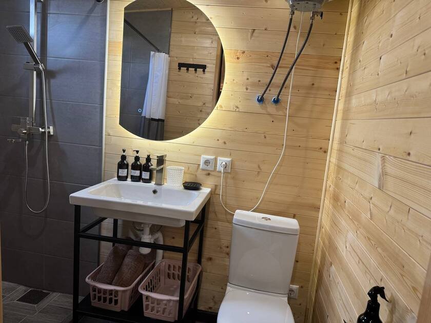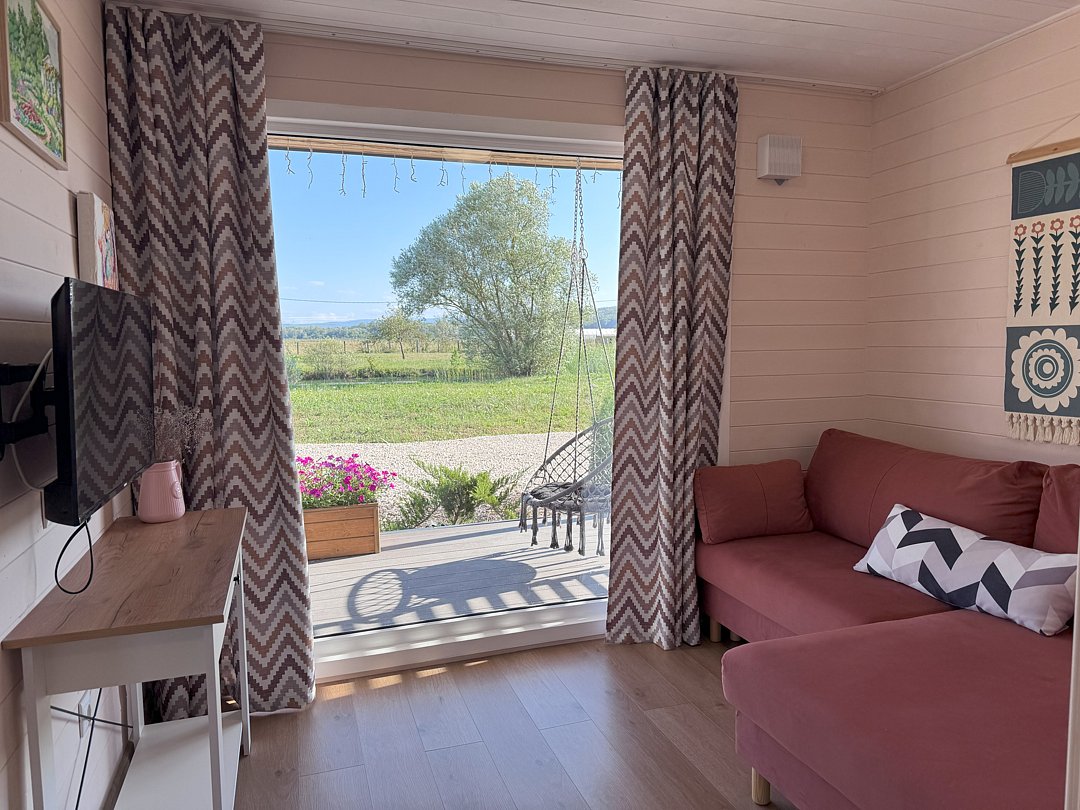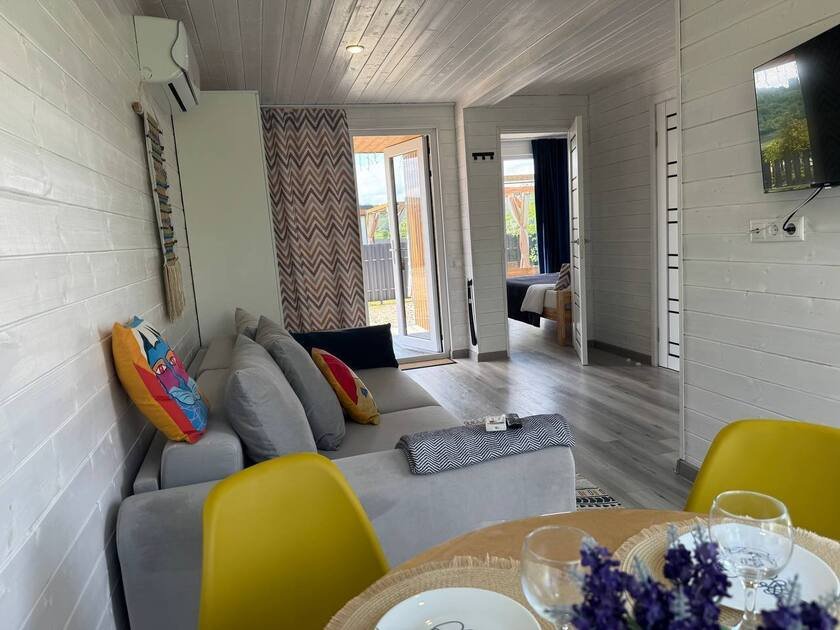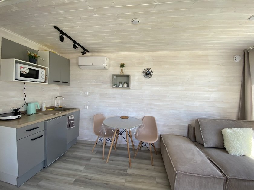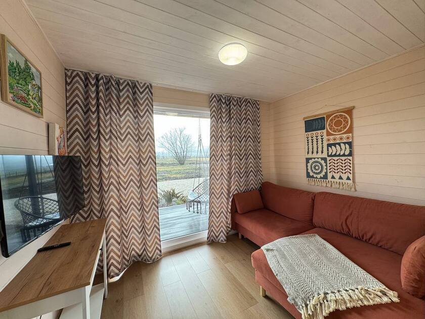 Собственная терраса. Собственная беседка и мангальная зона, парковка возле дома. Для вашего удобства в домике имеется холодильник, варочная индукционная плита, микроволновая печь, электрочайник, вся необходимая посуда, утюг, фен, цифровое TV, скоростной Wi-Fi. В холодильнике фермерские продукты.