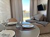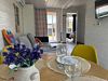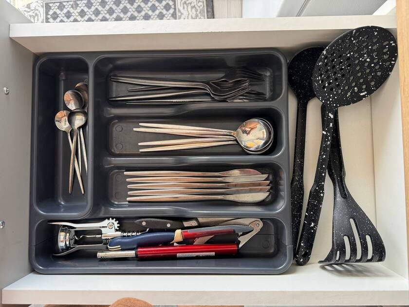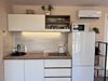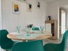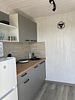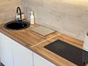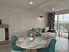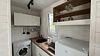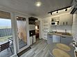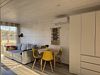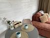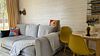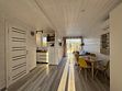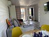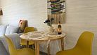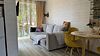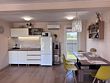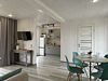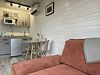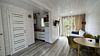 Объединенная зона кухни и гостиной позволяет комфортно готовить еду и проводить вечерний отдых вместе. Обстановка уютная и удобная благодаря мягкому дивану и обеденной зоне.
