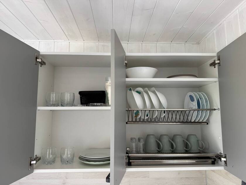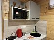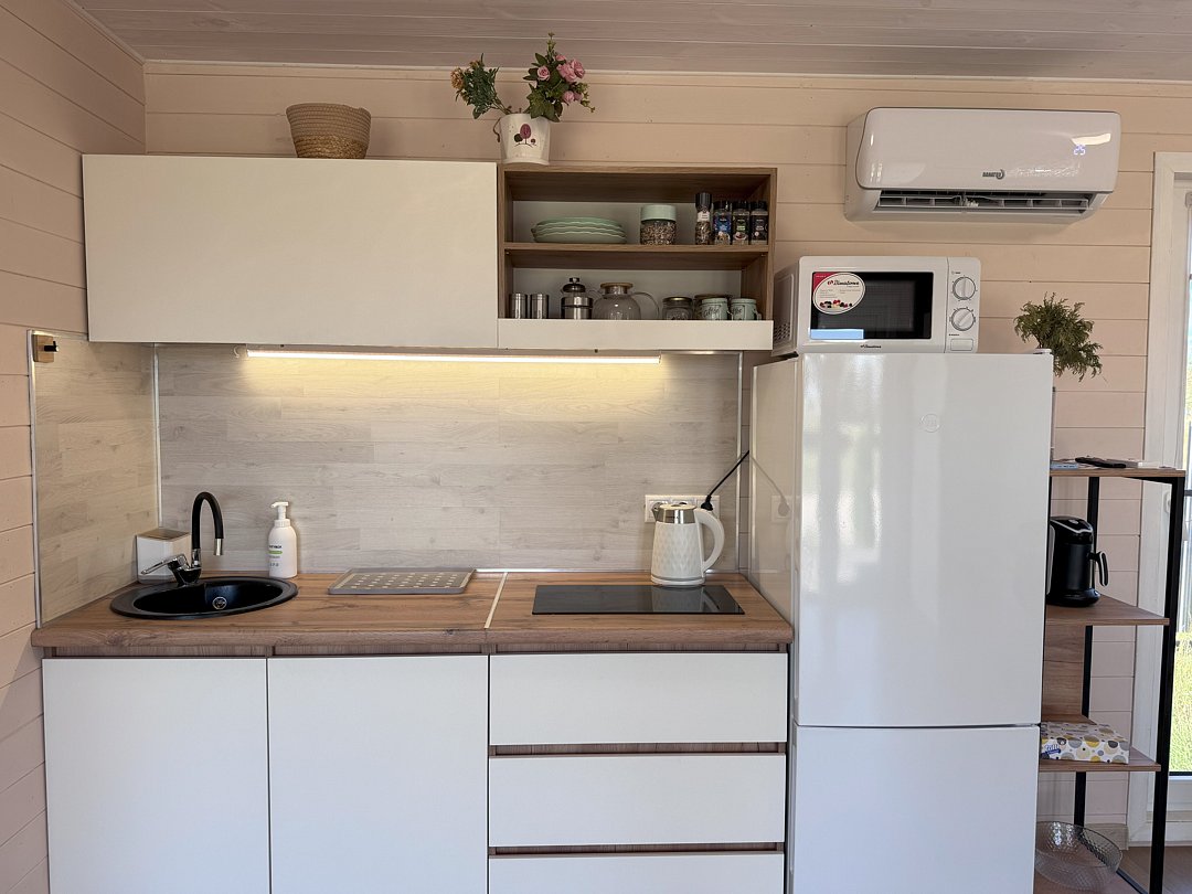 Бытовая техника: холодильник, варочная индукционная плита, микроволновая печь, электрочайник, вся необходимая посуда, утюг, фен, цифровое TV, скоростной Wi-Fi, горячая автономная вода. В холодильнике фермерские продукты.