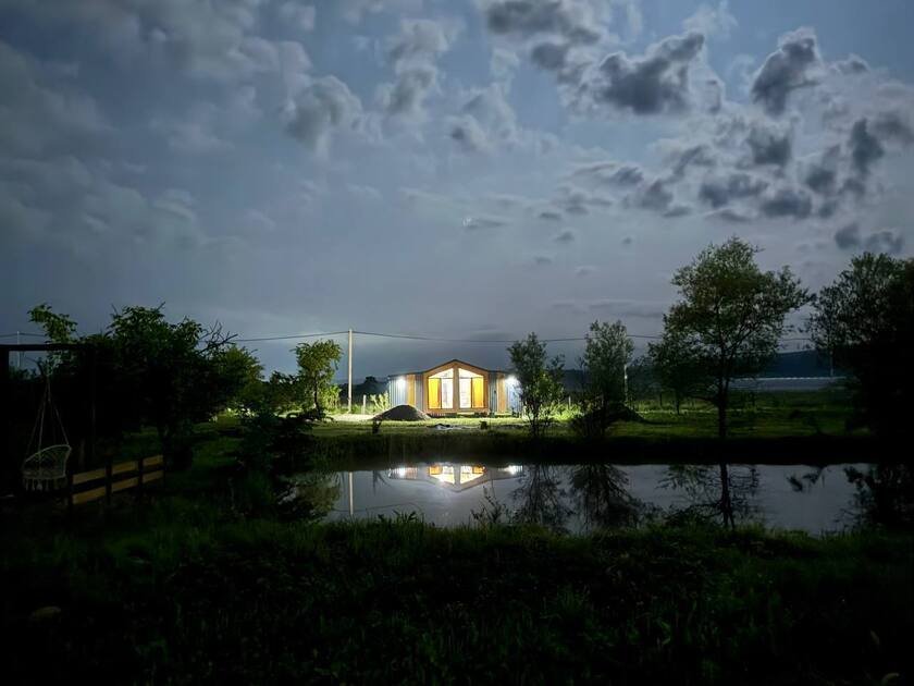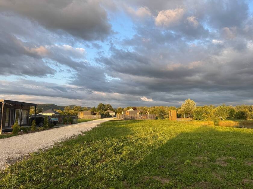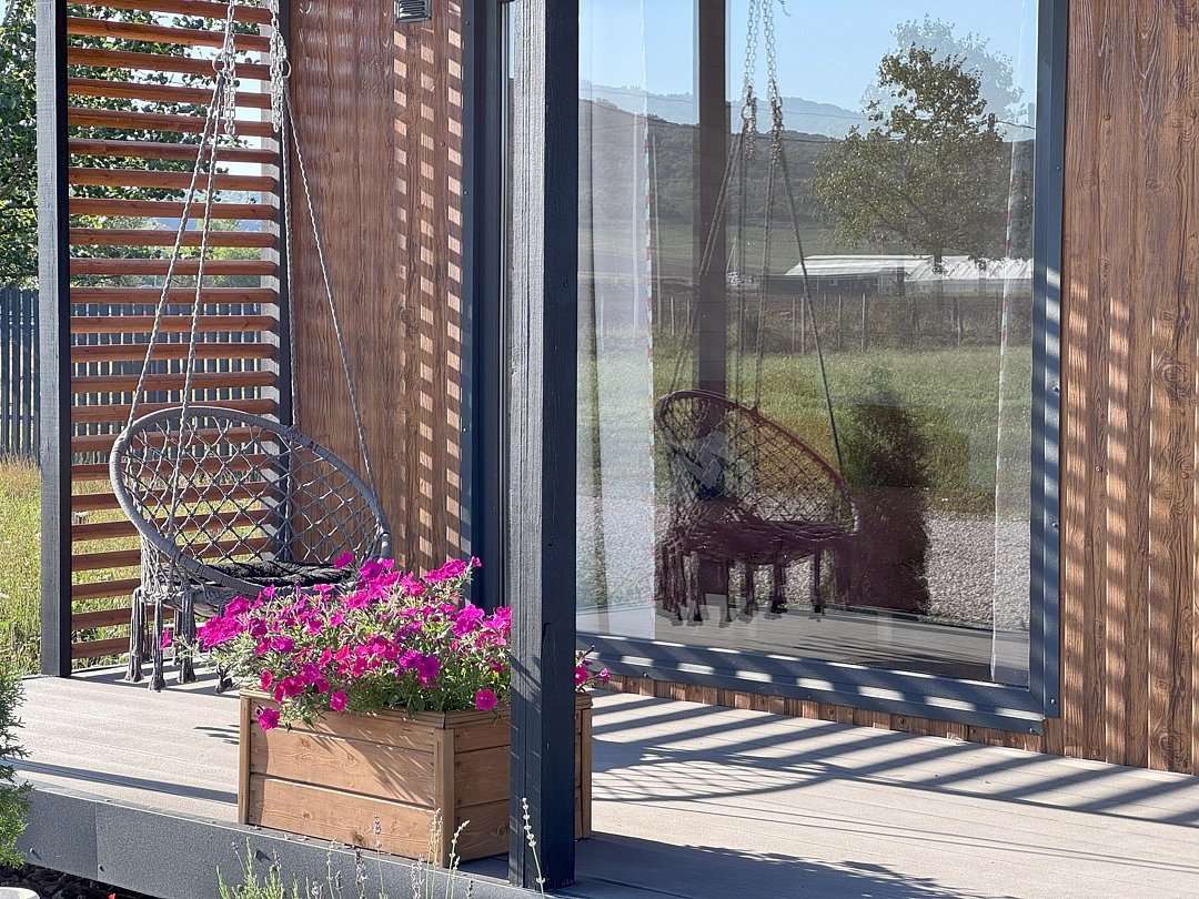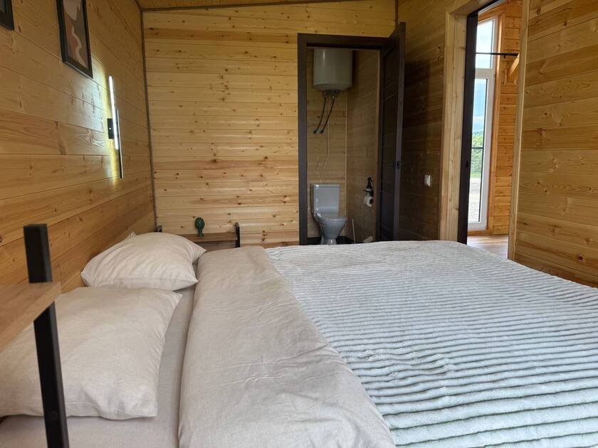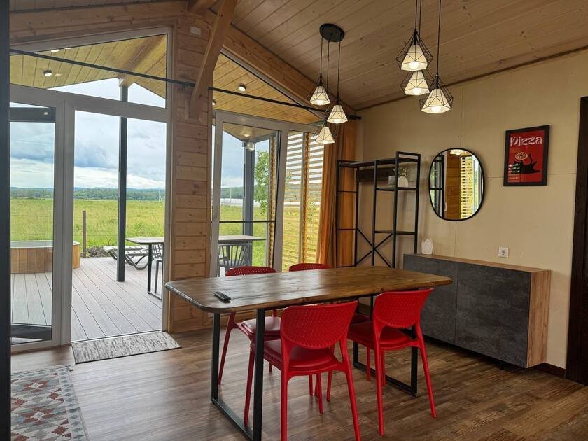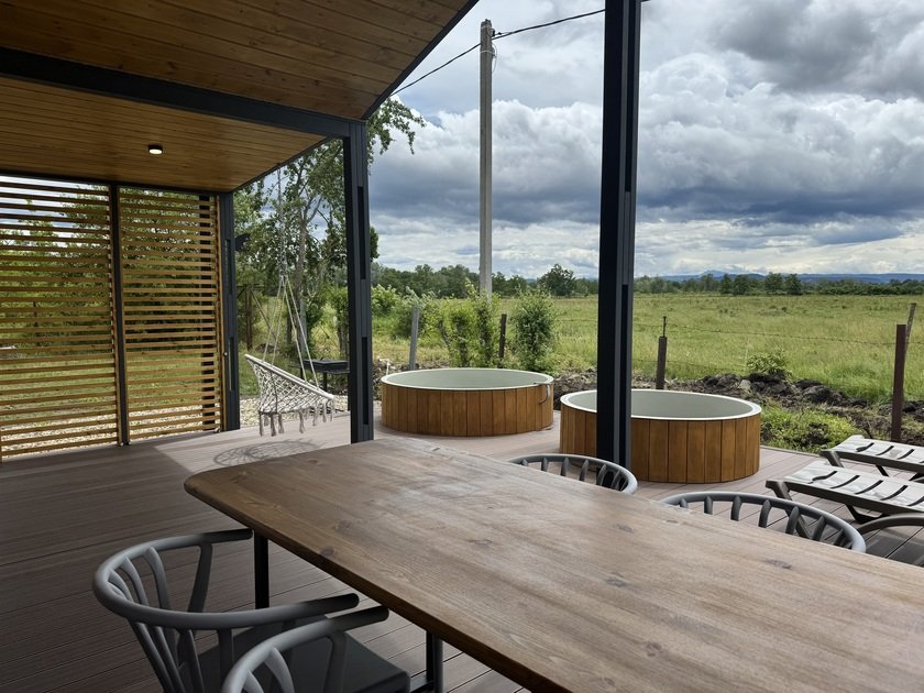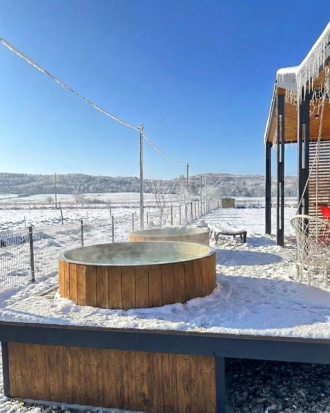 Дом с купелями 37°С и 20°С, а также баней или сауной. С террасой 40 м², отдельной спальней и кухней-гостиной. Дом уникален тем, что с его панорамных окон открывается вид на плато Лаго-Наки, горы Фишт-Аштенского массива и поля, а пасущиеся буренки, пение птиц и легкий ветерок добавят эмоций.