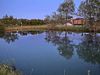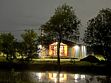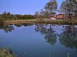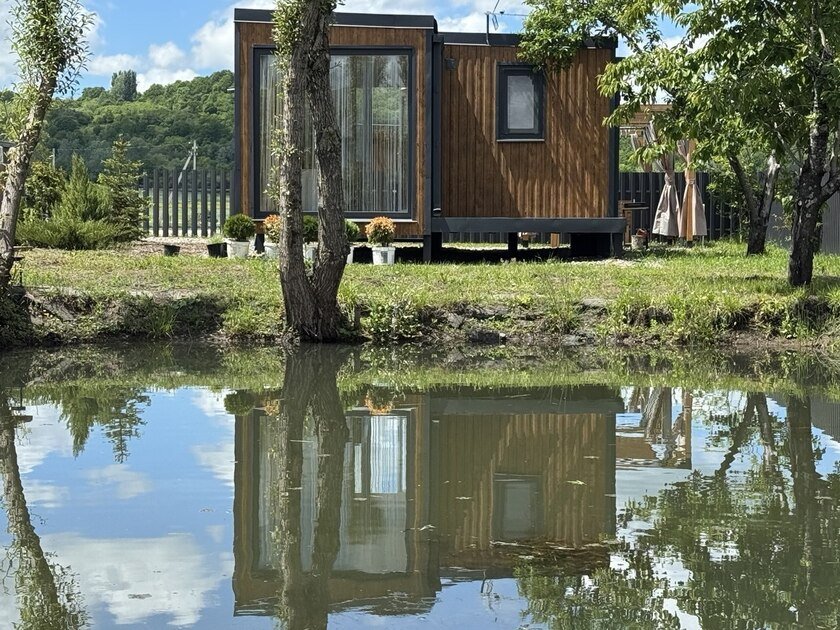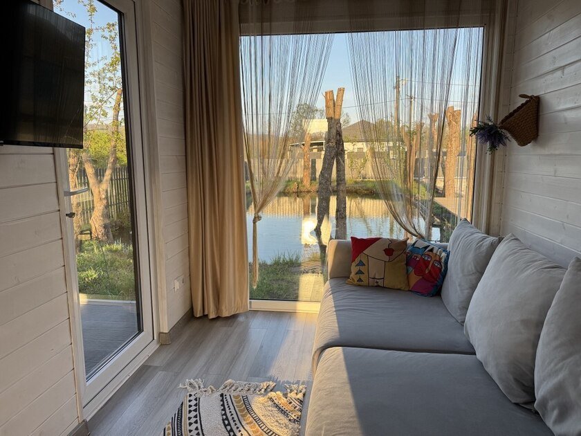 Дом с двумя террасами на берегу пруда с рыбками, подойдет для семьи с двумя детьми. Дом для двух–четырех человек с двумя террасами и панорамными окнами на берегу озера! Панорамные окна, две террасы. На берегу озера. Своя беседка и мангал. Парковка рядом с домом.